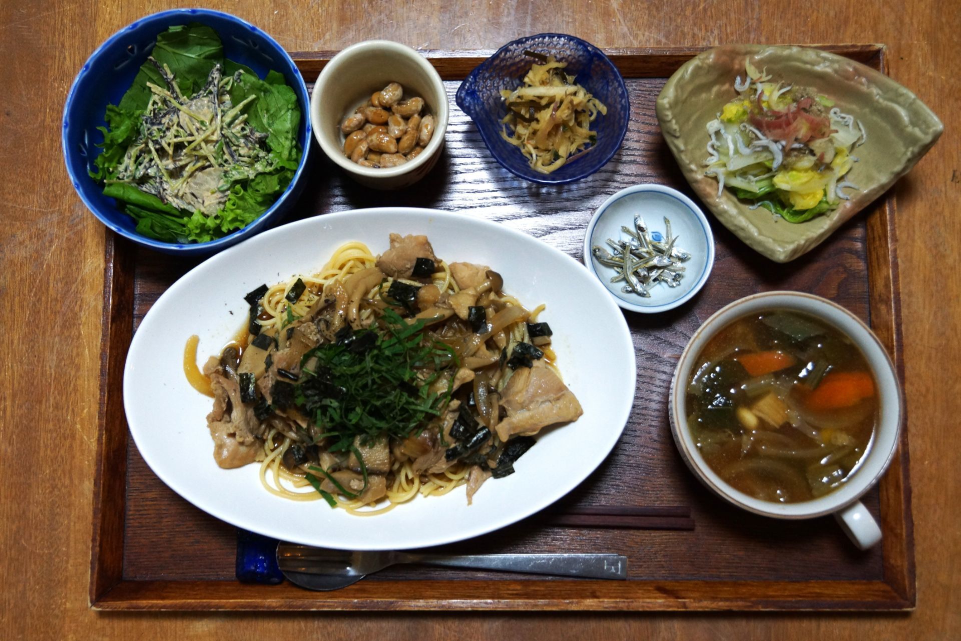鶏とたっぷりきのこのガーリック醤油パスタ
