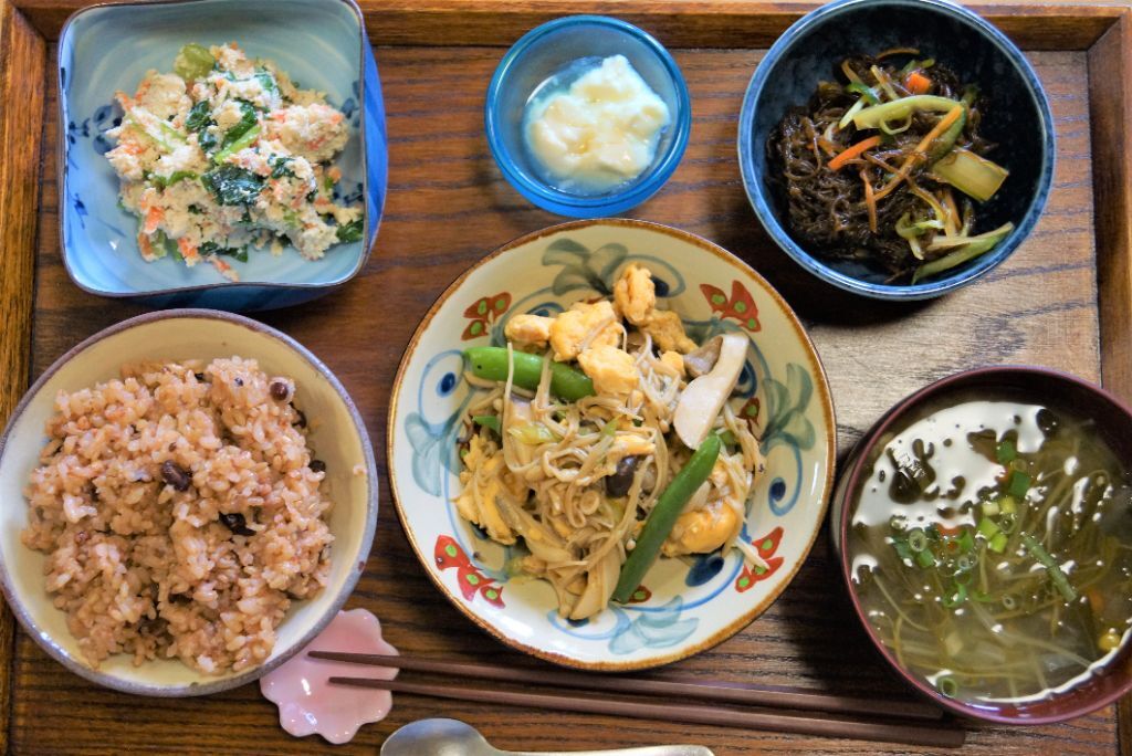 たっぷりのきのこを使った『卵と野菜の炒め物』副菜には『もずくの和え物』と『白和え』を♪