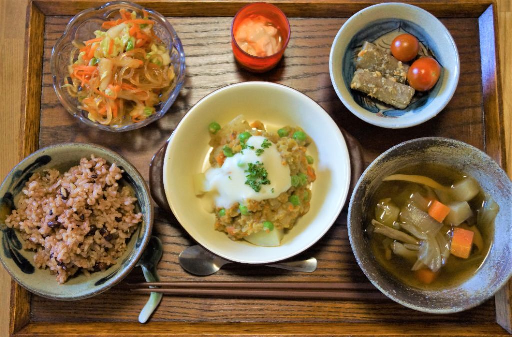 蒸したじゃが芋にスパイスの効いたソースと豆乳ヨーグルトで作ったビーガンチーズをかけた『蒸し芋の豆ソースかけ』♪