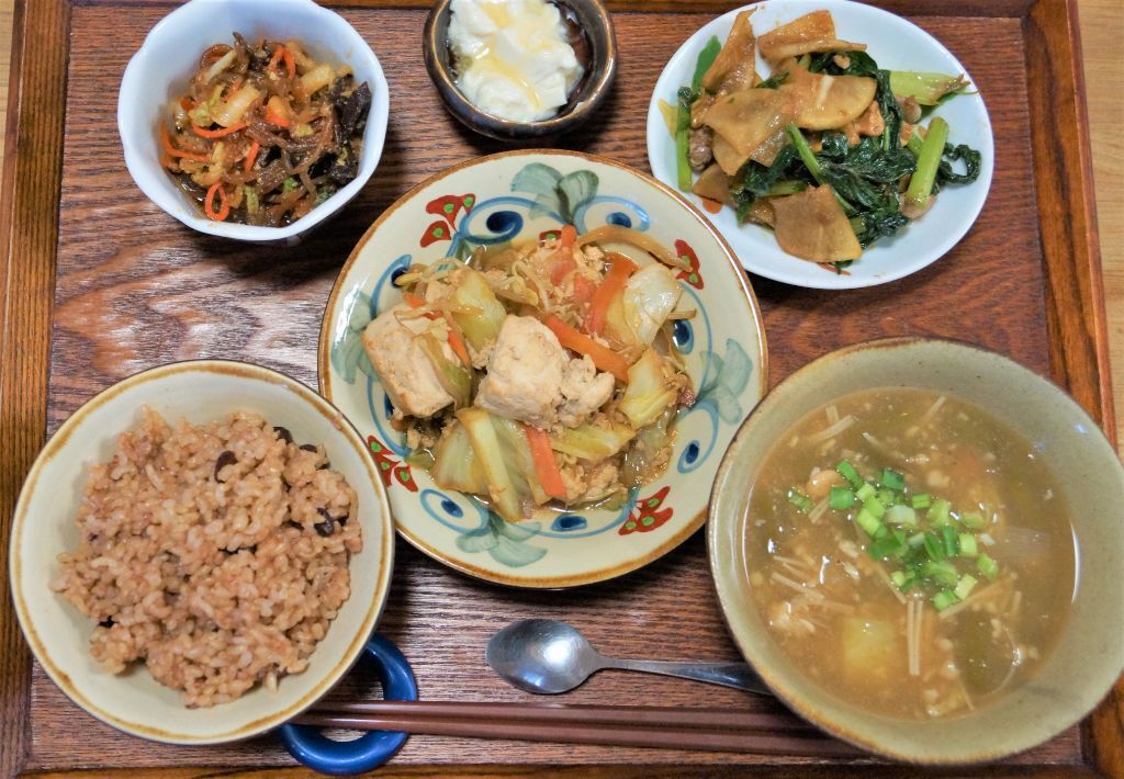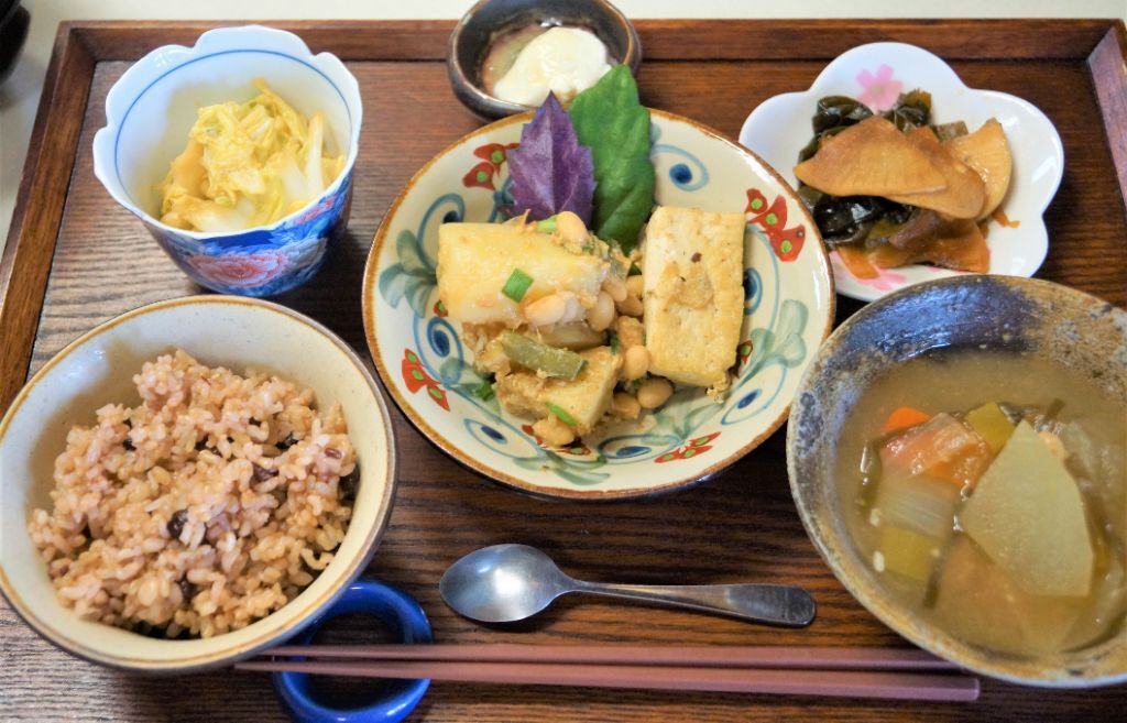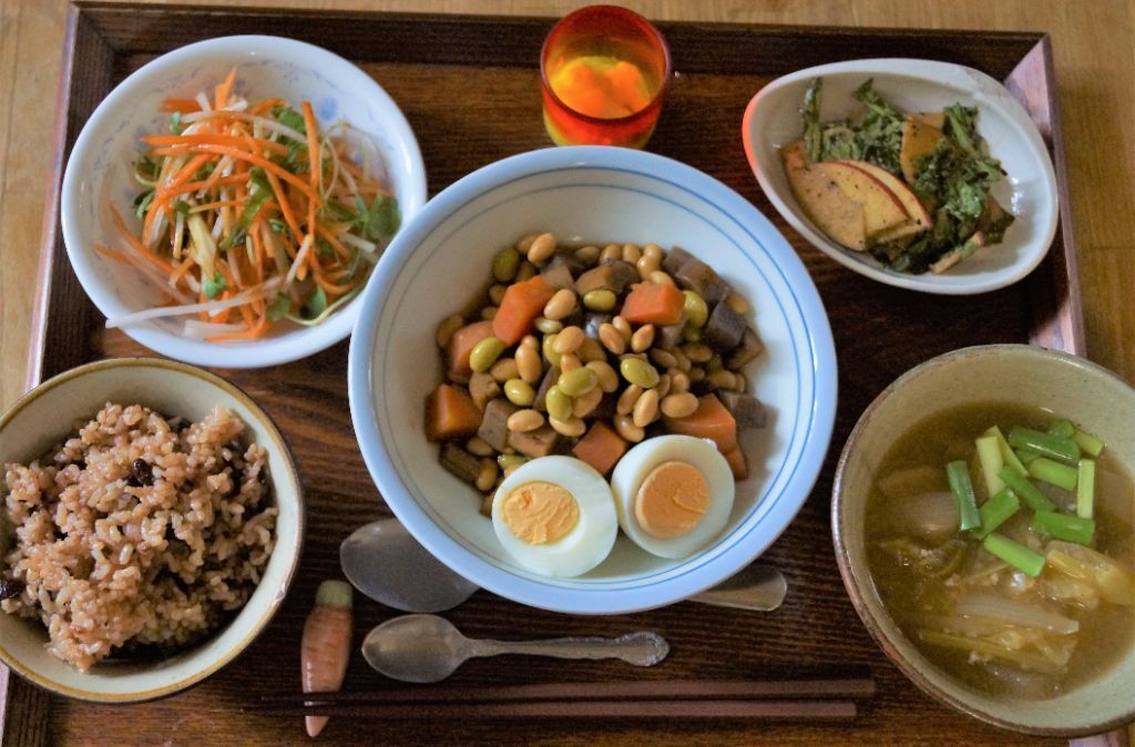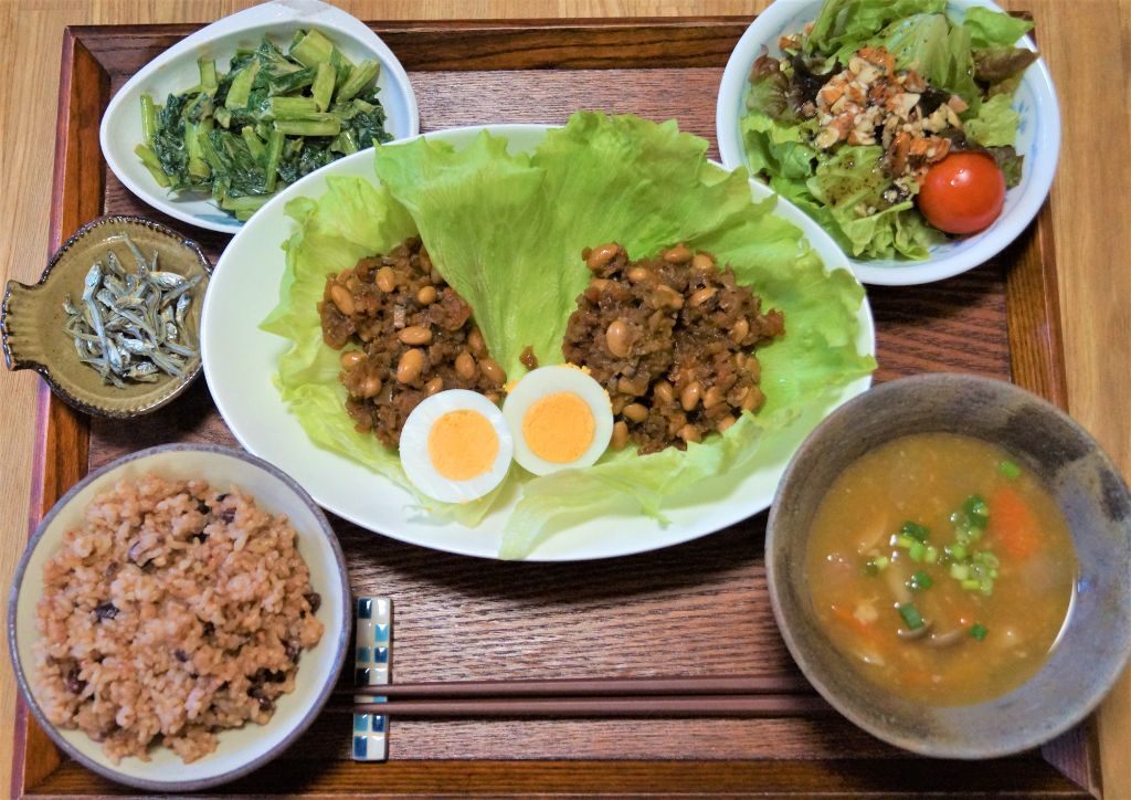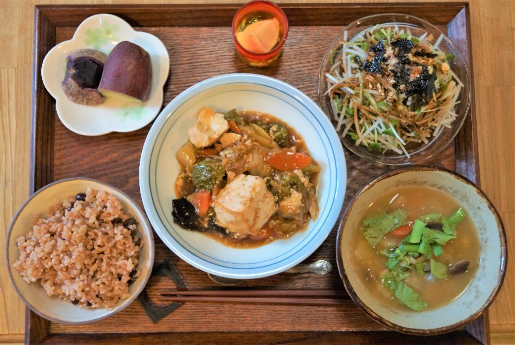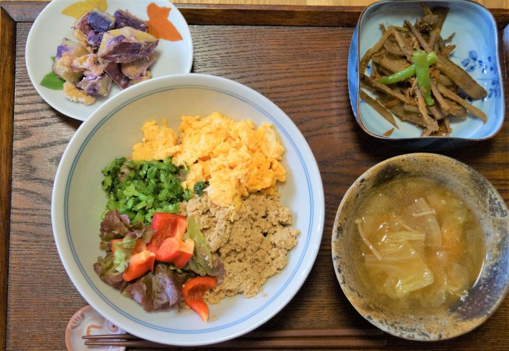 豆腐そぼろはまるでお肉のような食感♪副菜にはきんぴらごぼうと芋の和え物で食物繊維をたっぷりと♪