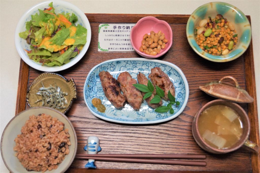 乳製品を使わないゆいクリニックではマヨネーズも豆乳で手作り♪えのきと小松菜を鯖にたっぷりのせて胡麻マヨソースを絡めてお召し上がり下さい♪