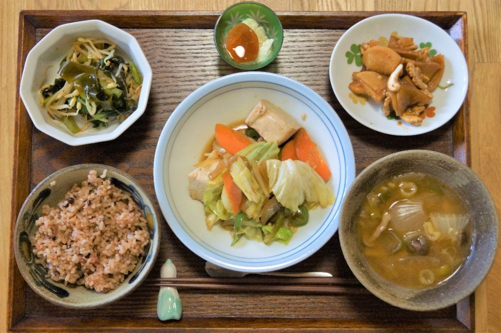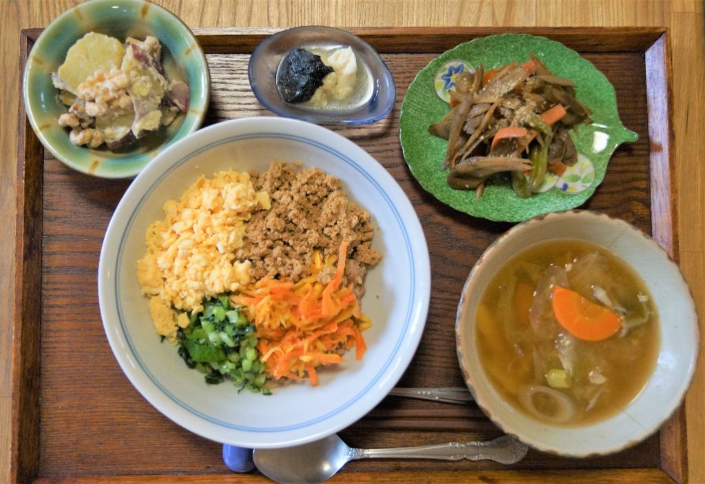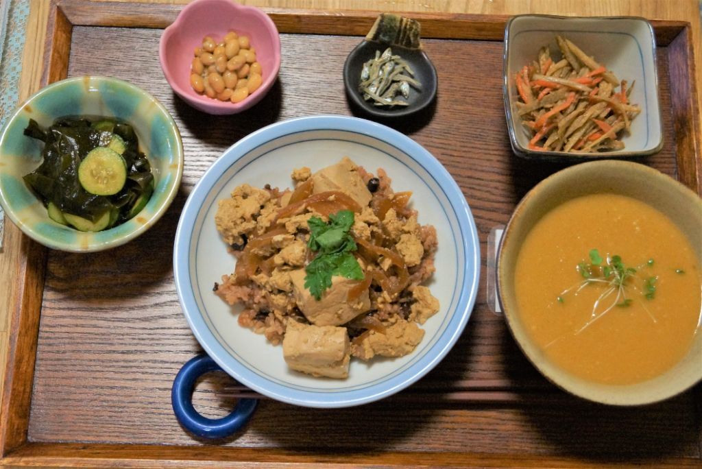 食物繊維たっぷりメニュー♪一度冷凍して解凍した木綿豆腐をお肉代わりのそぼろに!