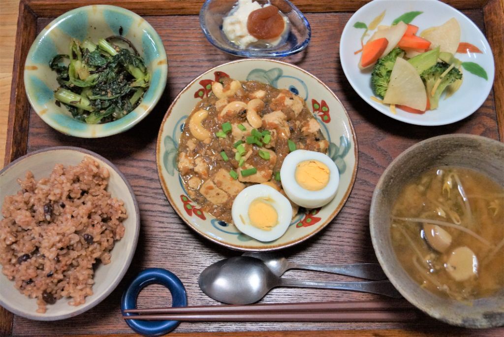 お肉の代わりにカシューナッツを入れて仕上げたべジ麻婆豆腐♪こんにゃくも入ってお腹の掃除に大活躍♪