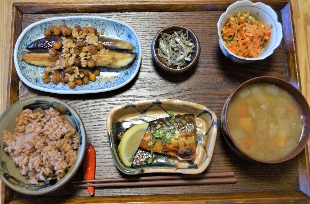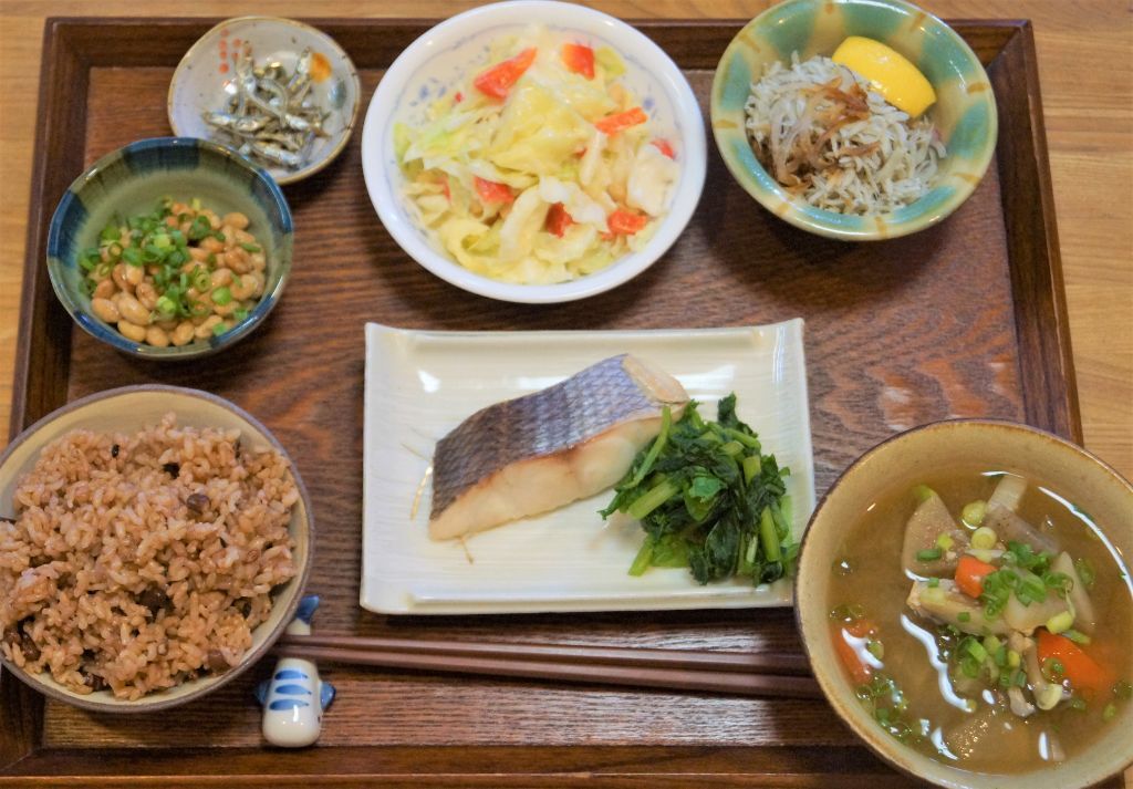 自家製塩麹の力で魚をふっくら美味しく焼き上げます。玉ねぎサラダは血液サラサラ・生活習慣病の予防にも良い。