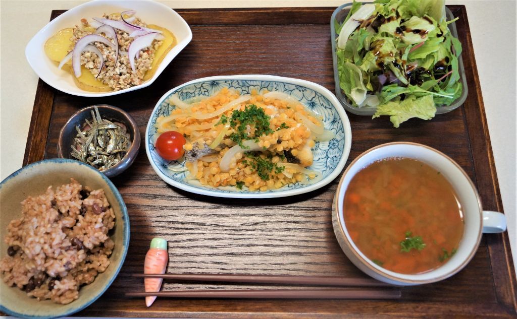 鉄分・ビタミンB・タンパク質・食物繊維を含むレンズ豆と白身魚で、高たんぱく低カロリー。