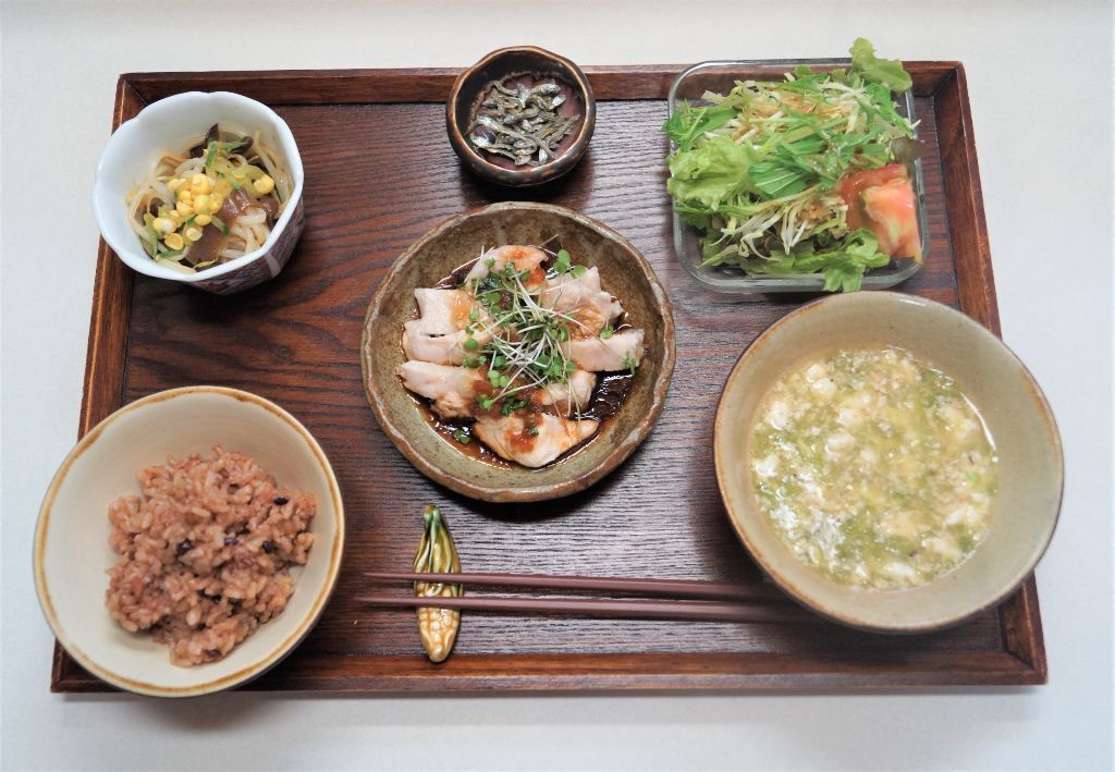 鶏むね肉を使った「高たんぱく低カロリー」献立。薬味の効いたソースで頂きます。
