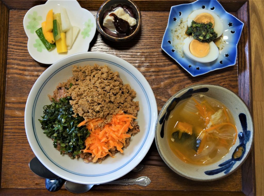 野菜と凍り豆腐で作るべジそぼろ丼。野菜は火を通さず塩もみ調理の簡単で美味しいレシピです。