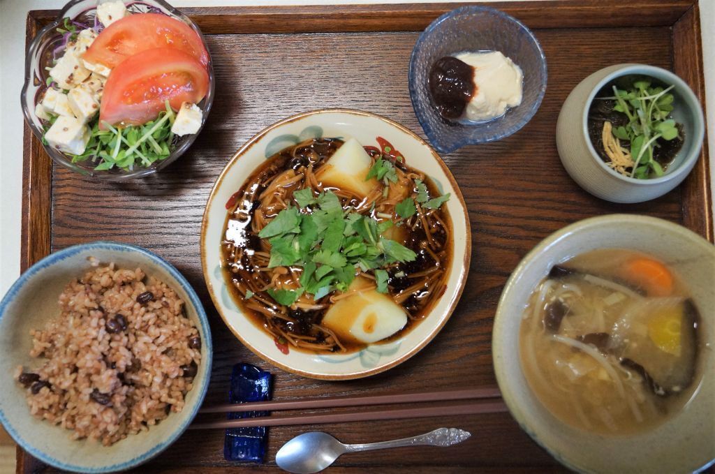 柔らかく煮たジャガイモとえのきだけに餡がよく絡みます。栄養価の高い豆苗は生で、各種ビタミンと葉酸を摂取。