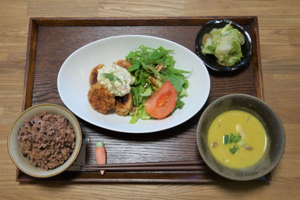 鶏つくねには、皮膚・粘膜の健康維持に役立つビタミンB6や、老化を防ぐセレンが豊富。生野菜サラダと一緒に♪