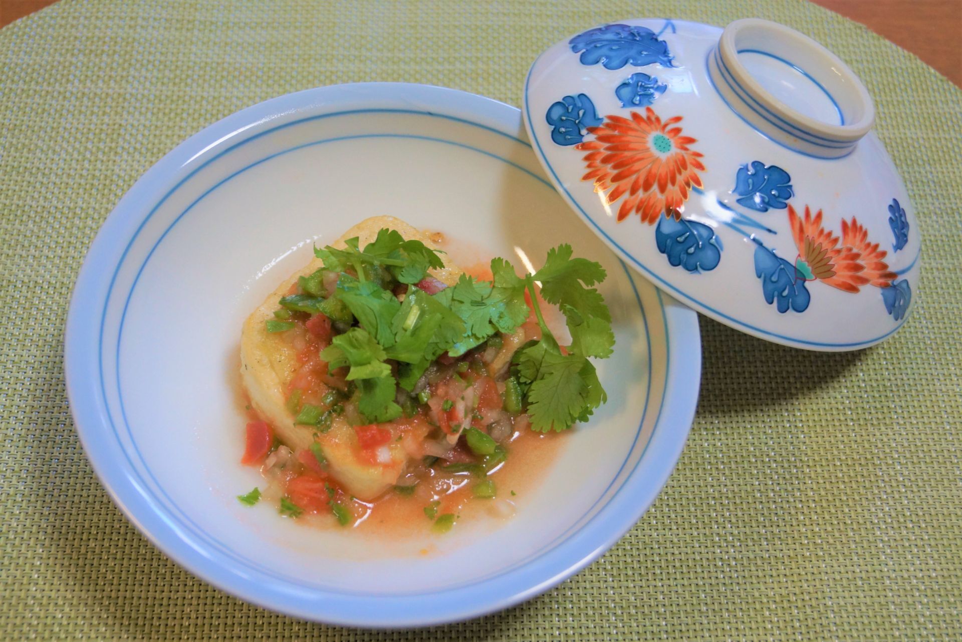 お皿に➍を盛り付け❸のサルサソースをかけたら出来上がり。お好みでパセリやパクチーを乗せて下さい!