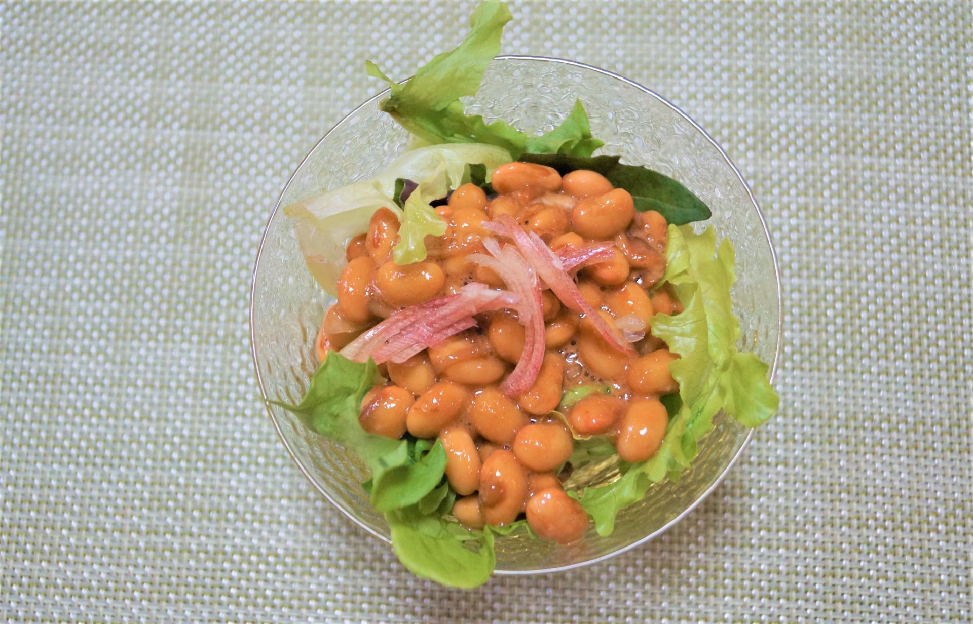 ボウルになめこと納豆を入れ混ぜ合わせ、めんつゆで調味する。