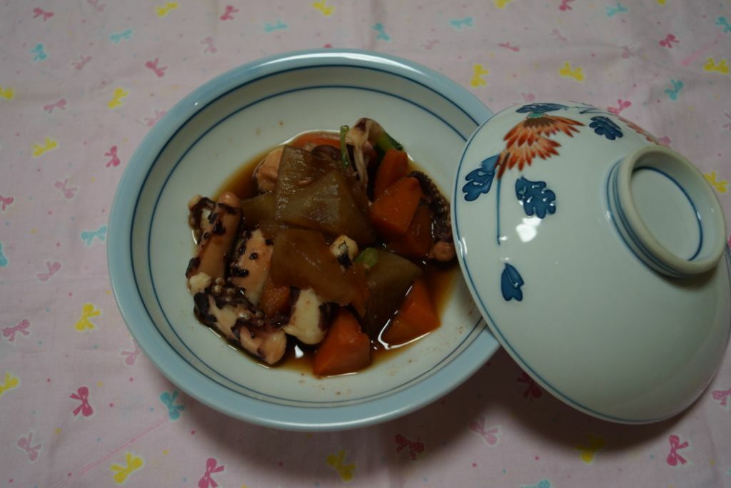 Homeレシピ紹介Yui Clinic 献立イカ大根の煮物 Categories: Yui Clinic 献立 イカ大根の煮物 当クリニックからレシピ紹介 Posted on 2019.2.252019.5.9 by ゆいクリニック (沖縄市の産婦人科) Tags: いか 人参 大根 小松菜 砂糖なし イカ大根の煮物 材料 (5人分) いか 500g 大根 300g 人参 200g 小松菜 75g 調味料 出汁 400g 酒 50g ハチミツ 20g みりん 20g しょうゆ 30g 塩 5g 1調理手順 いかは食べやすい大きさに切り、大根はそぎ切り、人参は乱切りにする。 2調理手順 大き目の鍋に大根、人参、いかを入れ、出汁、調味料を入れ強火にかける。 3調理手順 煮立ったらアクを取り、汁気が3分の1程度になるまで煮る。 4調理手順 器に盛り、小松菜などの青菜を飾る。