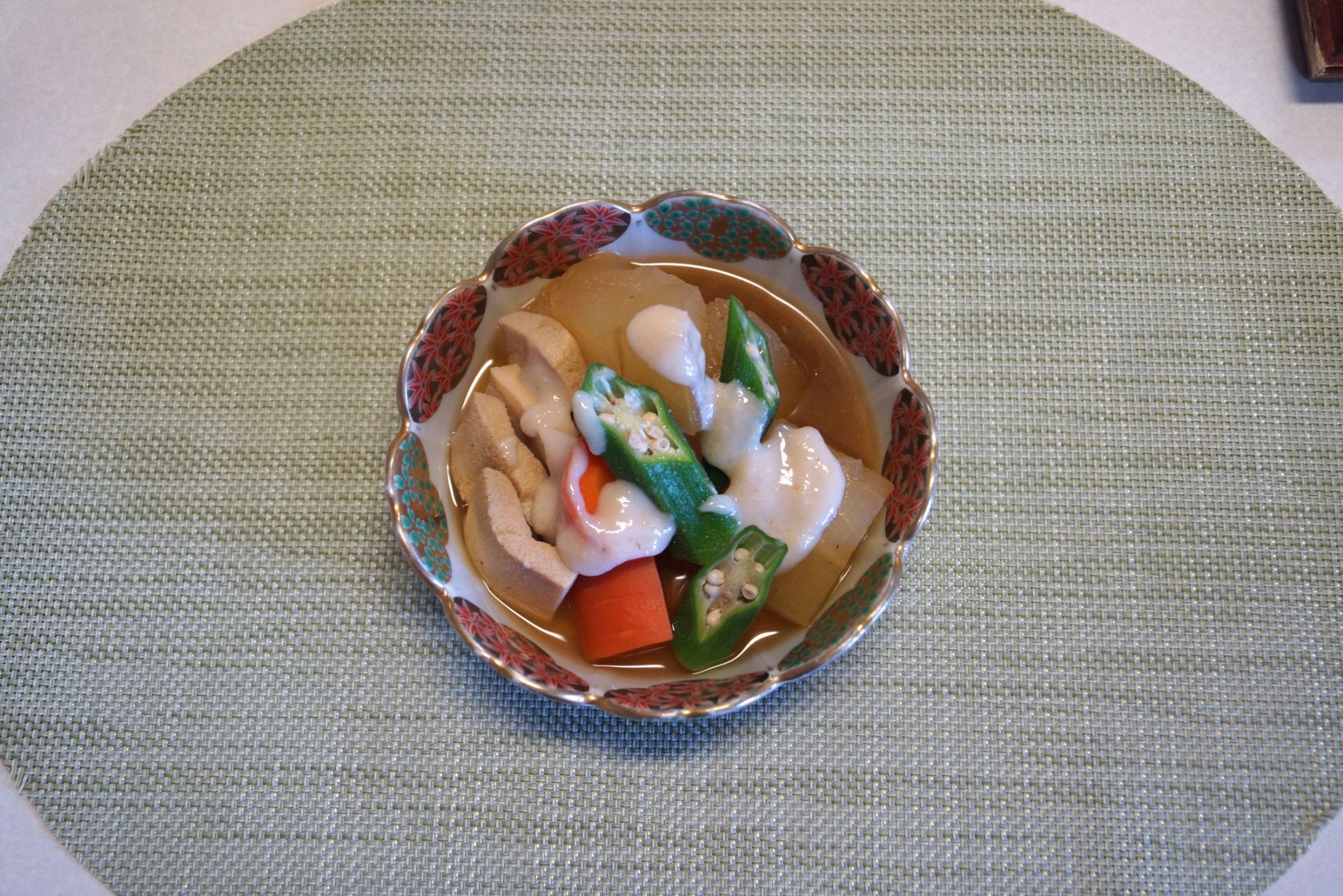 高野豆腐はパッケージの記載通りに戻す。カボチャ・人参・冬瓜は一口大に切り、いんげんは半分にカットしてさっと茹でておく。