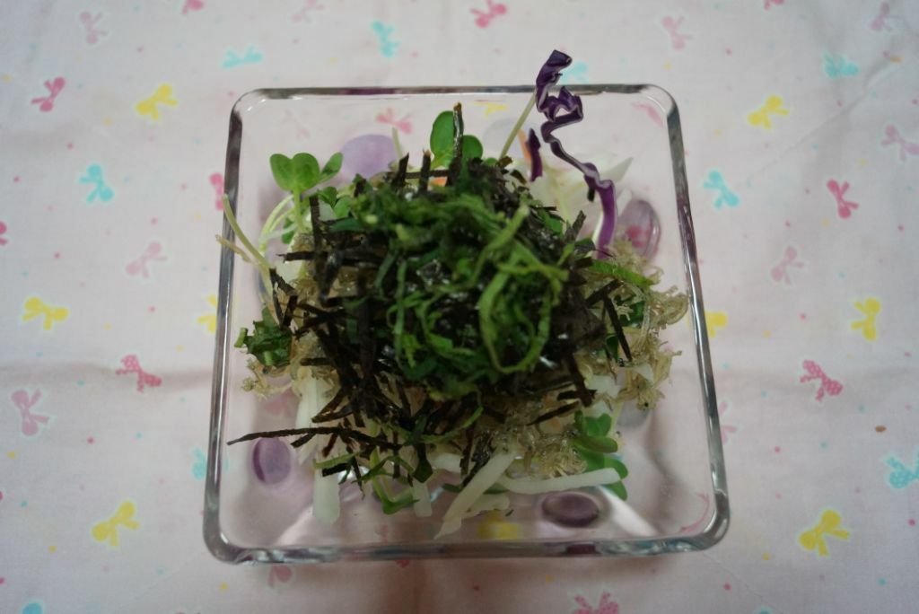 Homeレシピ紹介Yui Clinic 献立大根とじゃこのサラダ Categories: Yui Clinic 献立 大根とじゃこのサラダ 当クリニックからレシピ紹介 Posted on 2019.3.25 by ゆいクリニック (沖縄市の産婦人科) Tags: ちりめんじゃこ 人参 大根 大根とじゃこのサラダ 材料 (5人分) 大根 400g 人参 60g カイワレ 1パック じゃこ 50g きざみのり 適宜 調味料 酢 大さじ2 白いりごま 大さじ2 ごま油 小さじ3 だし汁 大さじ3 1調理手順 大根とにんじんは千切りにし、水にさらしておく。カイワレは根元を切る。 2調理手順 調味料を合わせてよく混ぜる。 3調理手順 フライパンに分量外のごま油を熱し、ちりめんじゃこをかりっとするまで炒め①と和える。 4調理手順 器に盛り、混ぜ合わせた②をかけて、きざみのりをちらして完成。