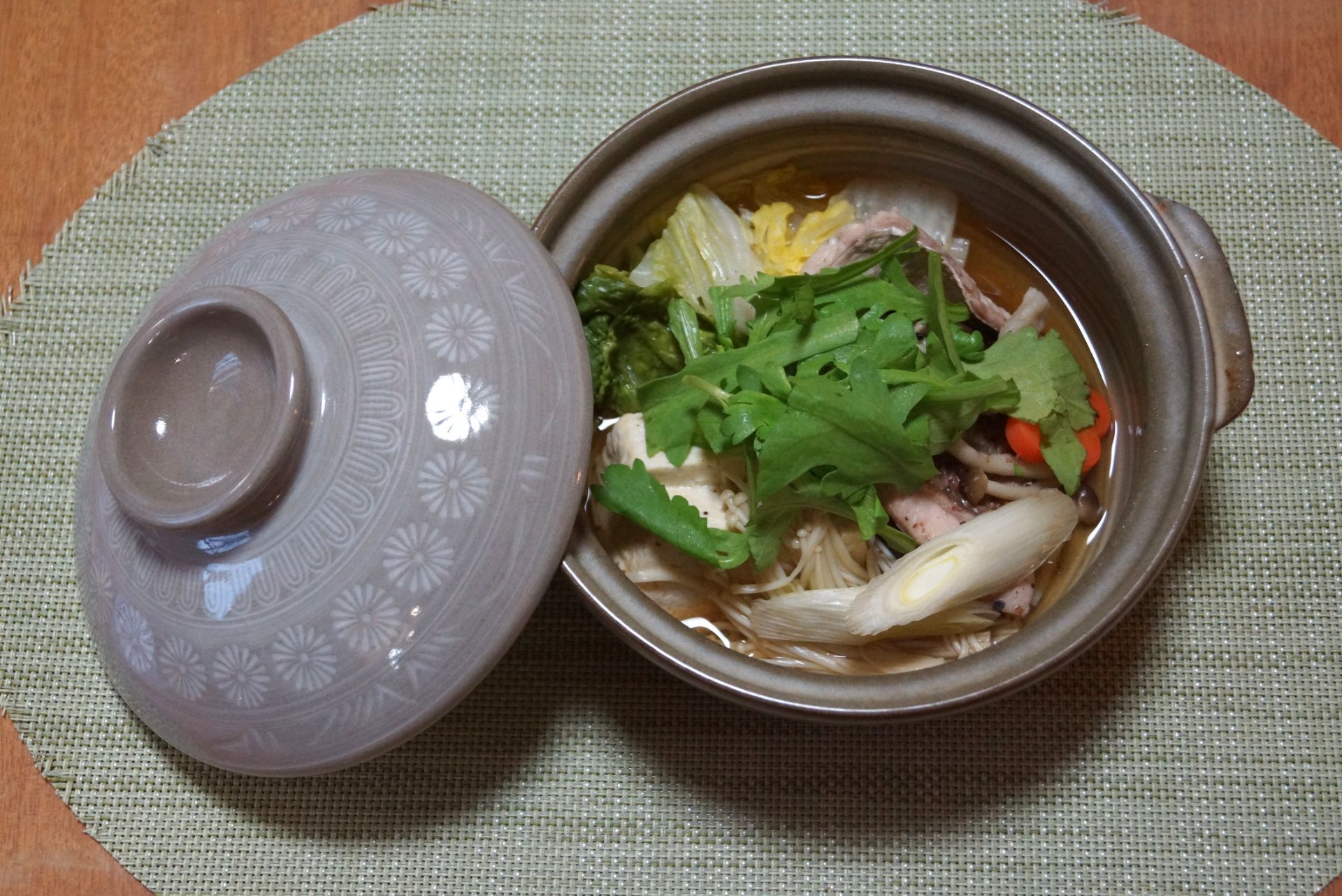 別鍋に春菊以外の具材を入れる。それぞれが混ざらないように同じ食材をひとまとまりにして並べていく。全て入れたらだし汁と調味料を入れてに火にかける。蓋をしてしばらく煮込み、野菜が柔らかくなったら火を止める。春菊を加えて再度蓋をし、余熱で火を通す。