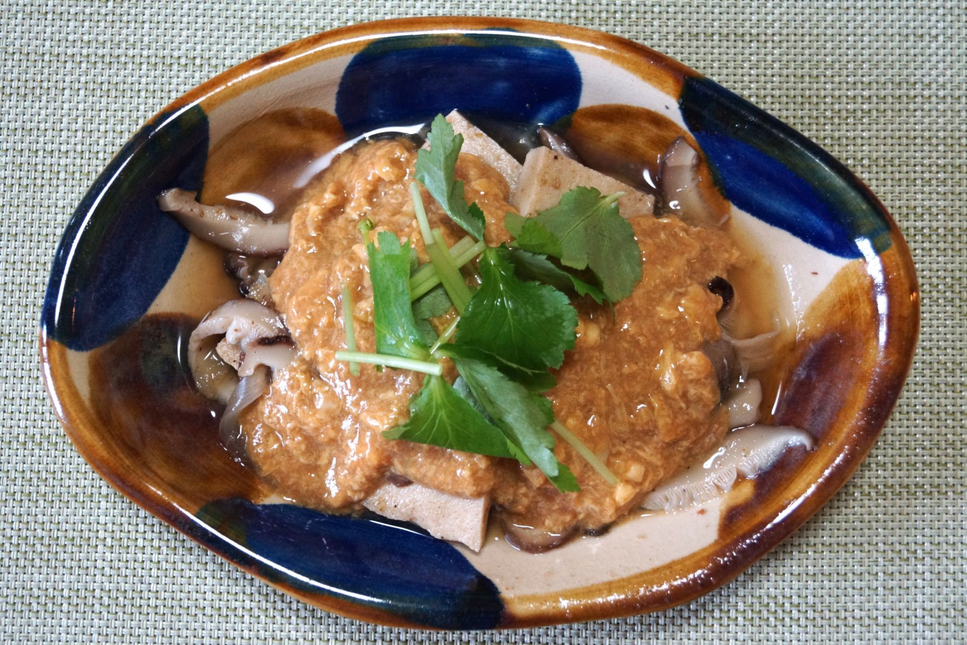 鍋に干ししいたけ・玉ねぎ・しめじとだし汁と醤油を入れ火にかける。塩で味を調え、高野豆腐を加えたら煮含める。