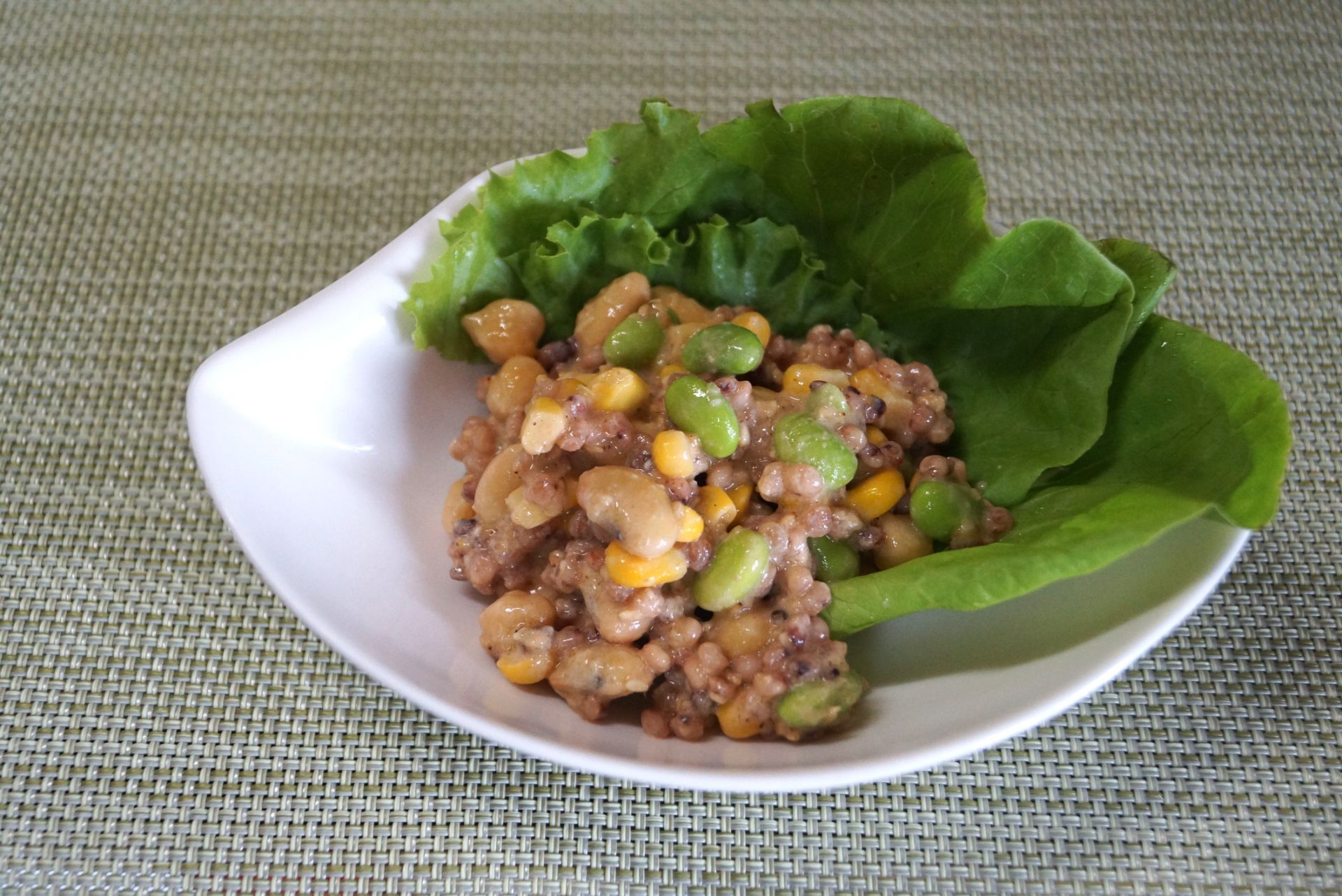 ミックスビーンズとコーンはさっと茹でる。レタス類は一口大に切る。
