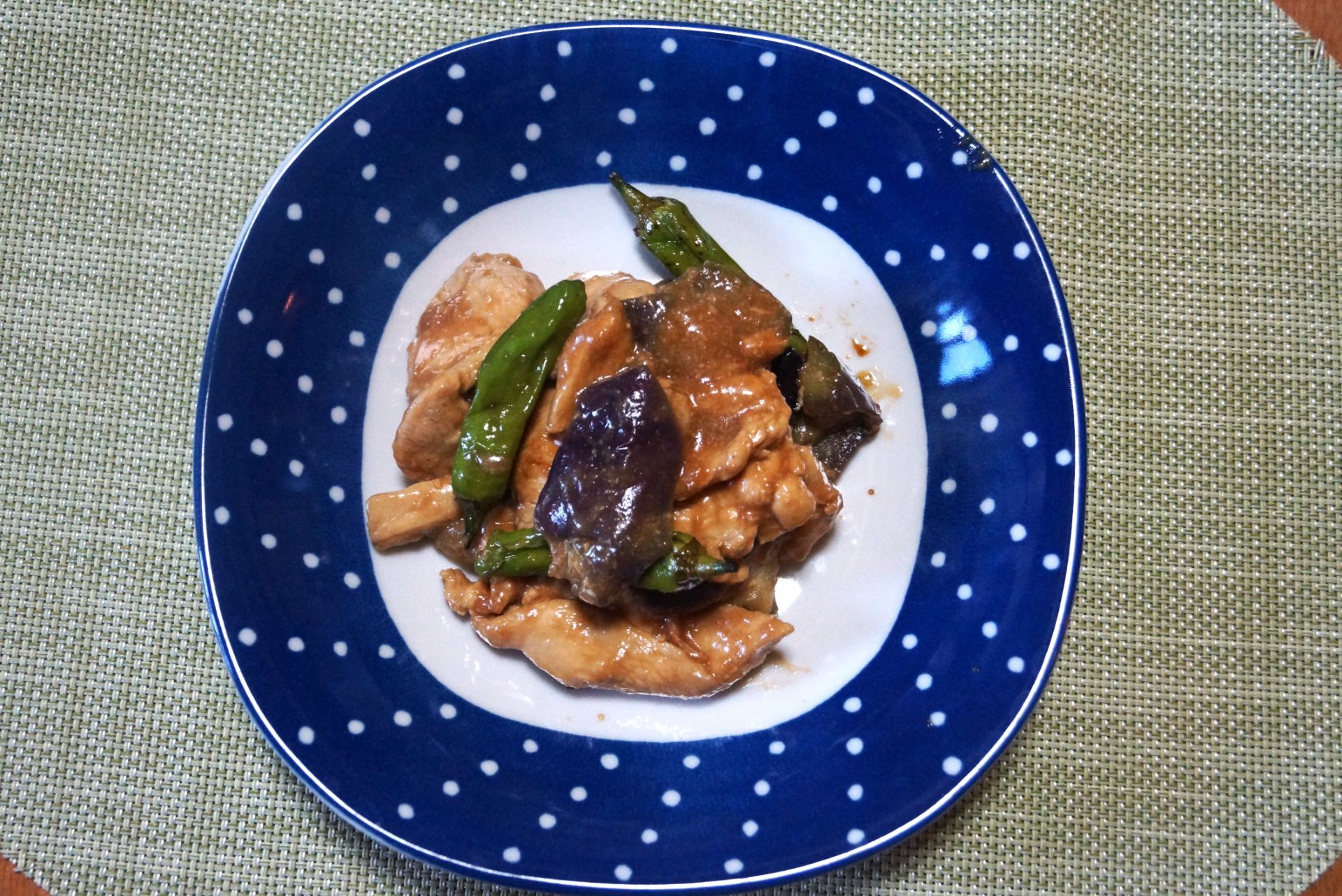 鶏むね肉は一口大に切り、塩コショウと豆乳マヨネーズを合わせて1時間程漬け込んでおく。茄子は乱切りにしてむし、しし唐はお好みに切る。