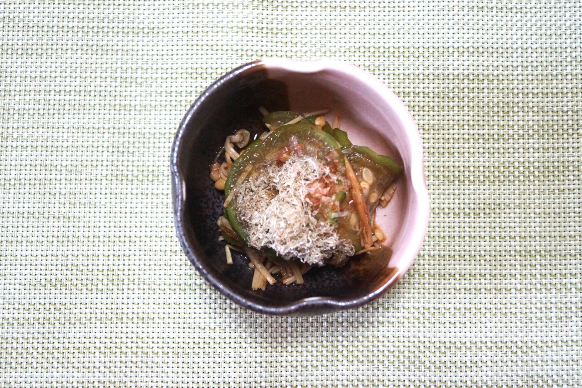 ❶が熱いうちにすりおろし生姜・醤油・みりん・だし汁・柚子胡椒を混ぜ合わせ、粗熱がとれるまで浸しておく。