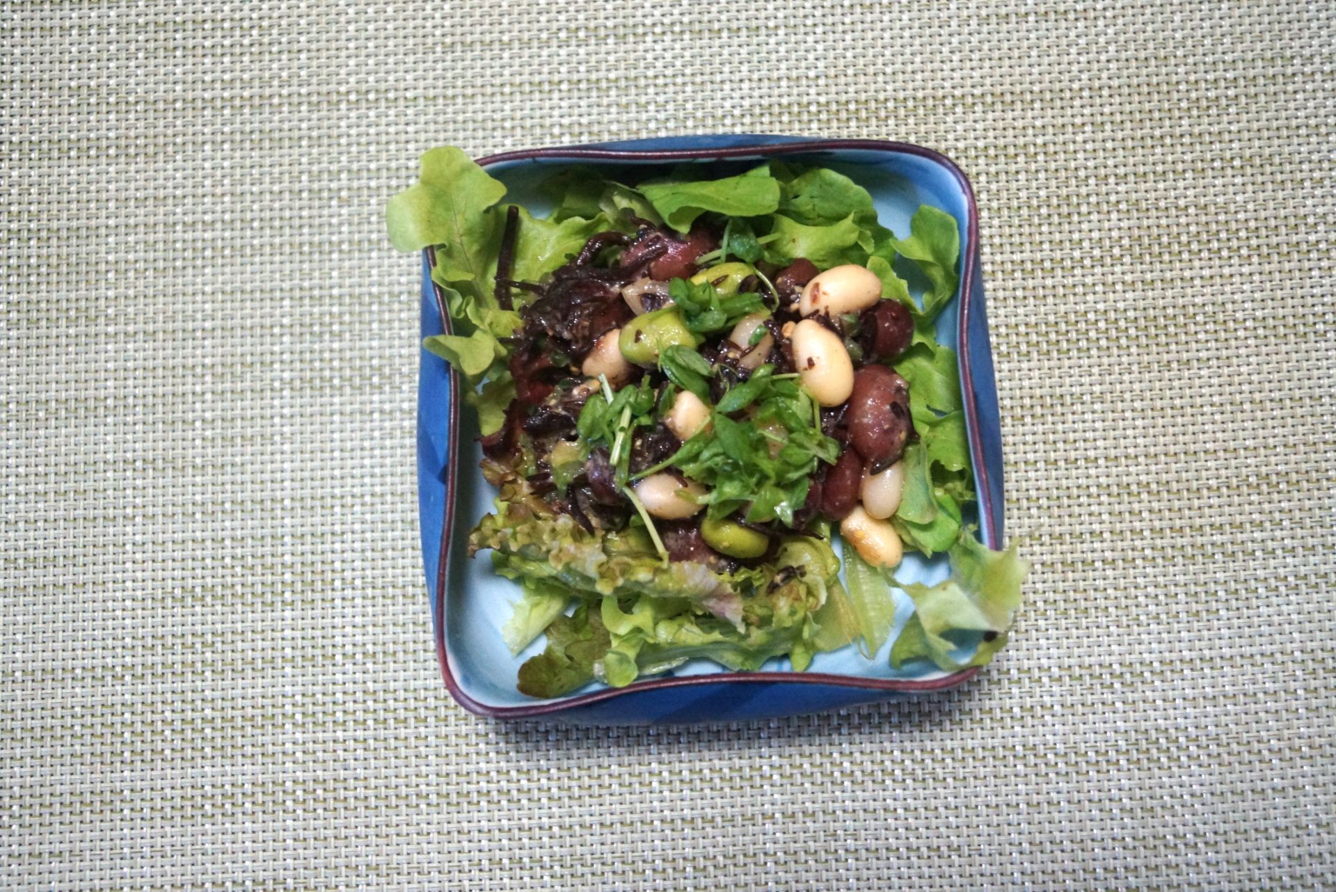 ❷に水気をしっかり切ったひじきとゴーヤー・ミックスビーンズ・豆苗を入れて和える。