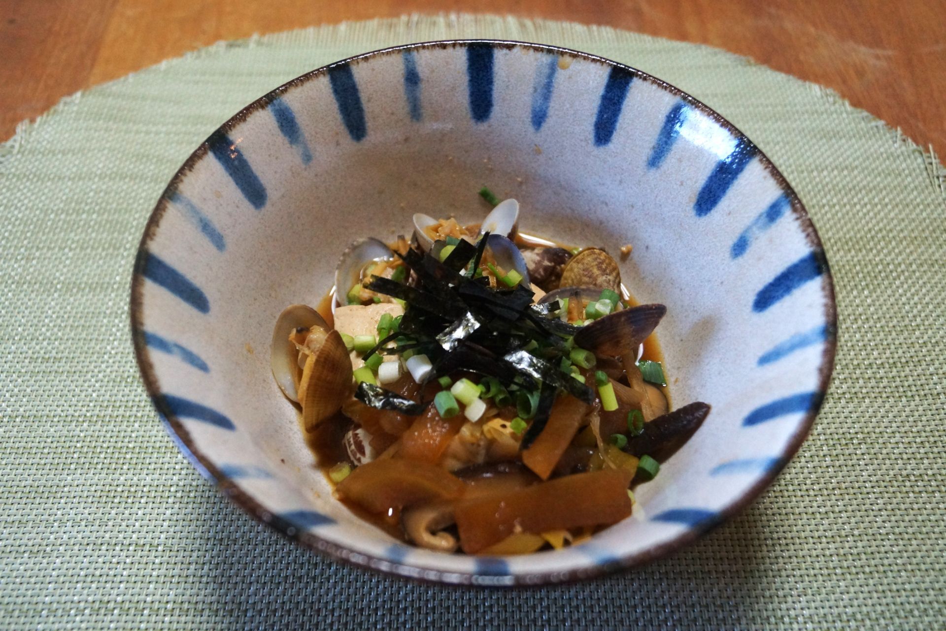 干しシイタケは水で戻し干し切りにしておく。豆腐は水切りし、一口大に切る。あさりは分量のだし汁から少量を使い小鍋で火を通しておく。