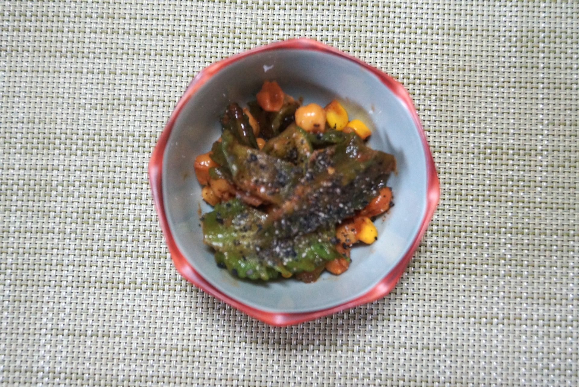 うりずん豆は薄切りにしてさっと湯通しし、すぐに冷水で冷ます。茹でひよこ豆とコーンはさっと茹でる。赤ピーマンは乱切りにして軽く塩もみする。