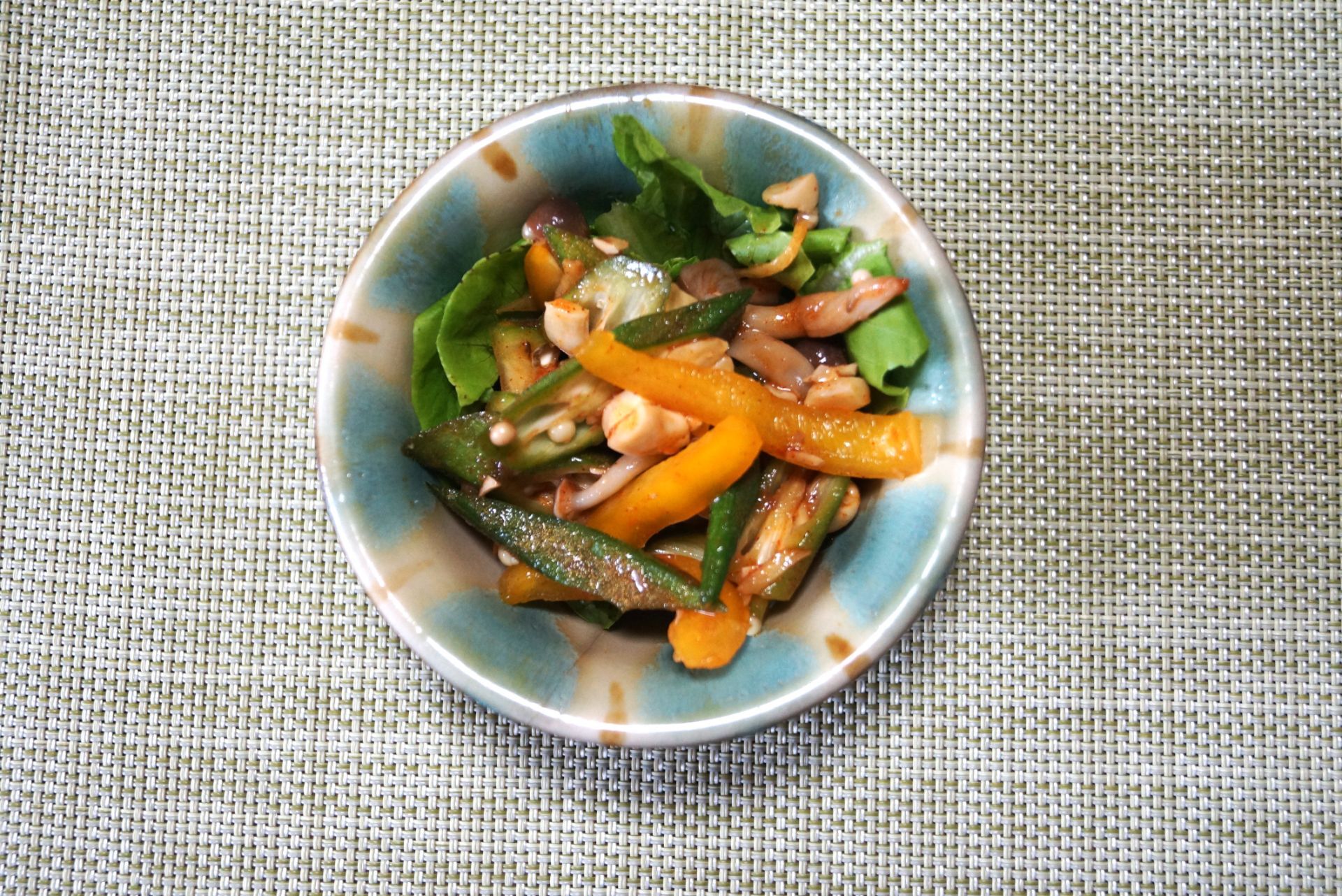 オクラは薄切りにする。しめじはほぐしてさっと茹でる。黄パプリカは細めの乱切りにする。生姜は細切りにする。レタスは一口大に切る。生ナッツは浸水させて刻む。
