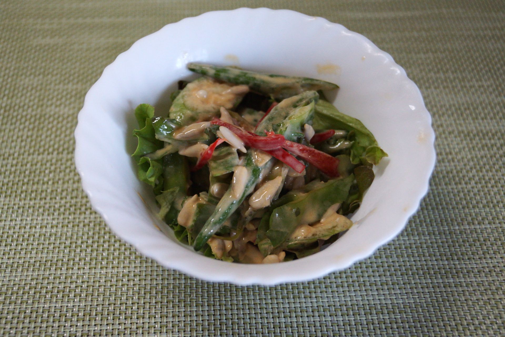 うりずん豆は斜め薄切りにしてさっと茹で、すぐに冷水で冷ます。オクラは斜め薄切りにする。赤ピーマンは千切りにする。レタス類は一口大に切る。生ナッツは浸水させて砕く。