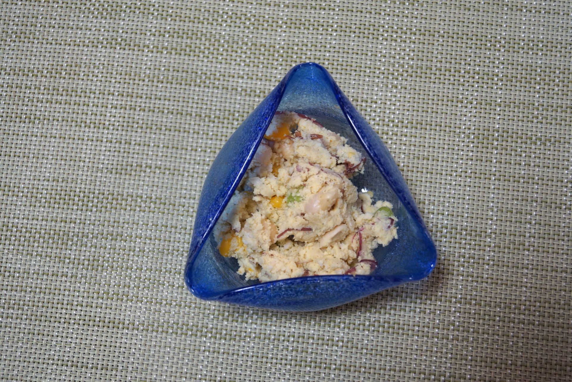 おからは蒸しす。コーンとミックスビーンズはさっと茹でる。玉ねぎは薄切りにして水にさらす。
