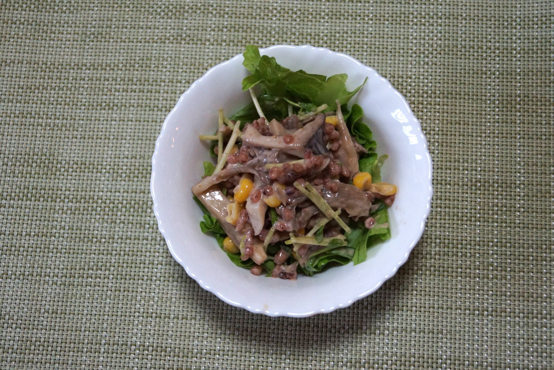 ❷に水気を切ったきのこ類・コーン・高きび・豆苗を加えて和える。