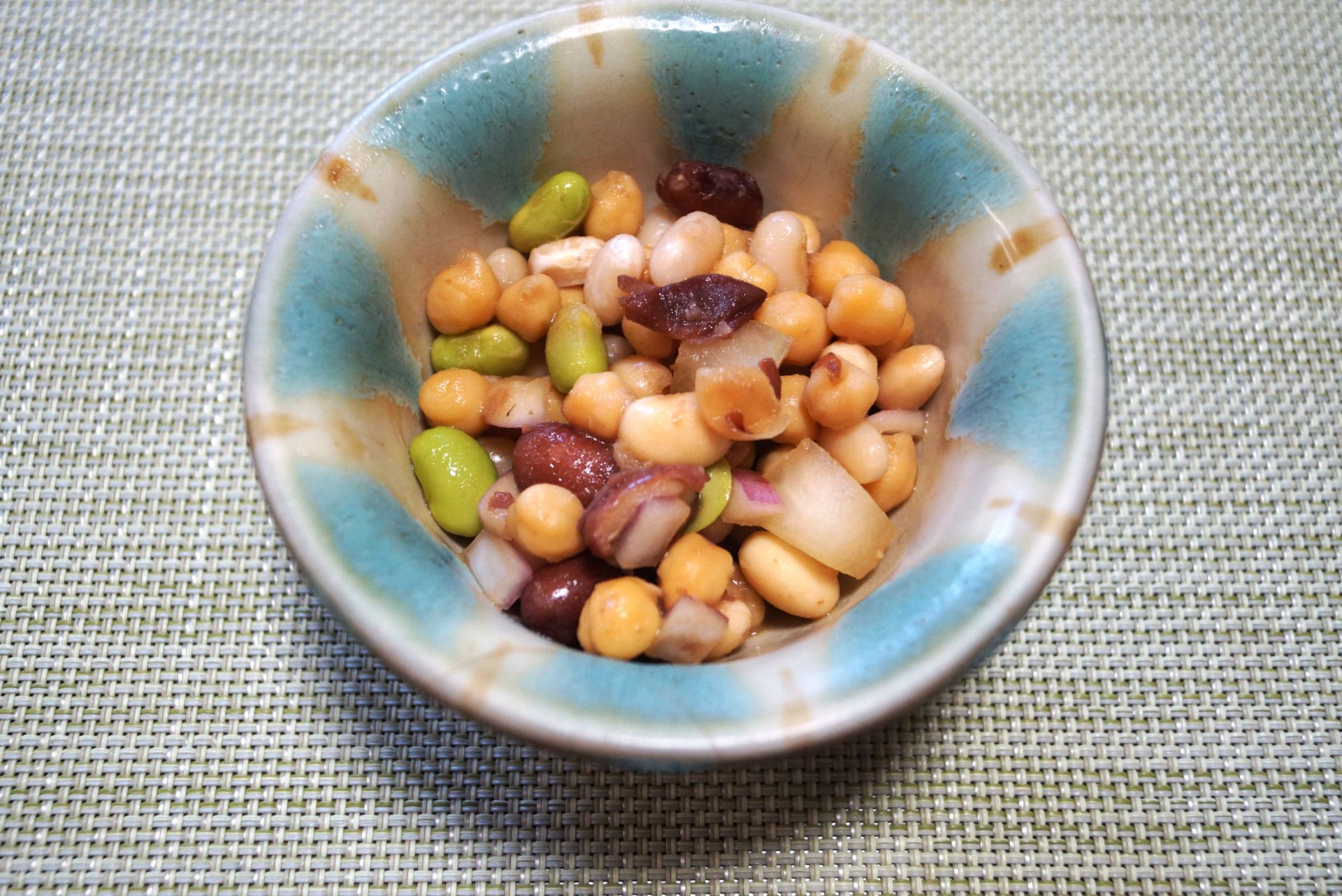 豆類・冬瓜・紫玉ねぎの水気を切ってニンニク・ウドズオイル・バルサミコ酢・醤油・甘酒を加えて混ぜ合わせ、味が馴染んだら出来上がり。
