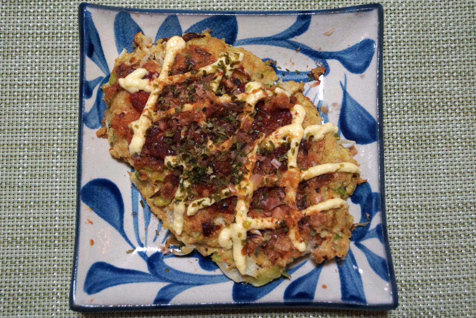 器に❹を盛りつけて❺のソースを塗り花かつおと青のりを散らしたら出来あがり。
