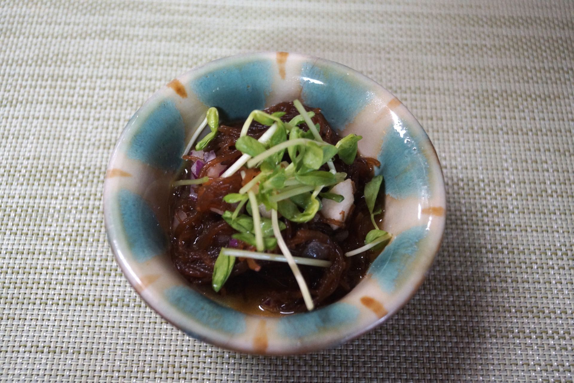 もずくは流水で洗い、塩抜きしてざく切りにする。玉ねぎは粗みじん切りにして水にさらす。長芋はさいころ状に切り変色防止のため、少量の酢を混ぜておく。豆苗は2㎝の長さに切る。