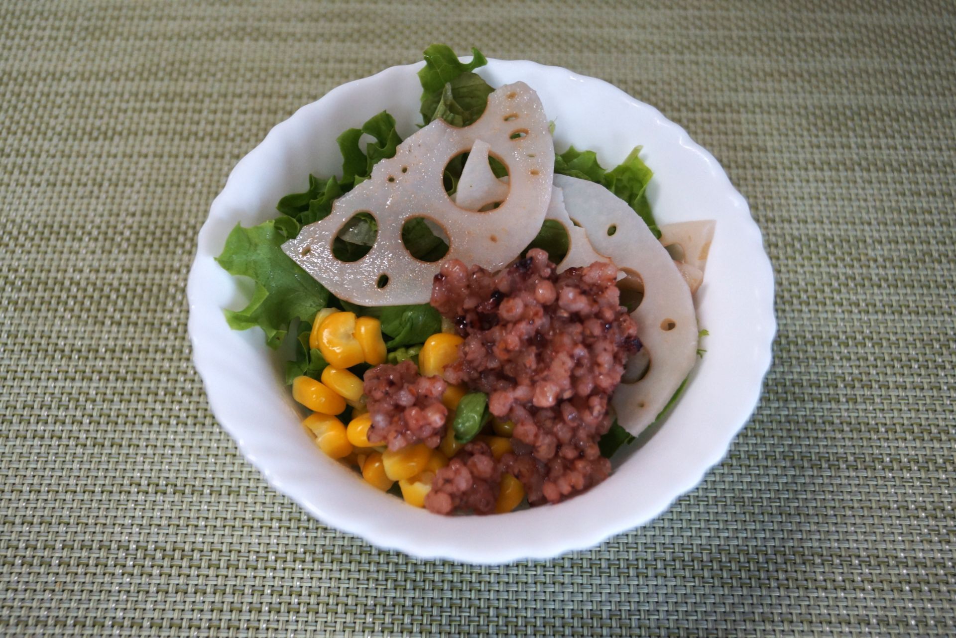 器にレタスを敷き、その上にレンコンをのせ、コーンと高きびと豆苗を散らす。混ぜ合わせた❷をかけたら出来上がり。