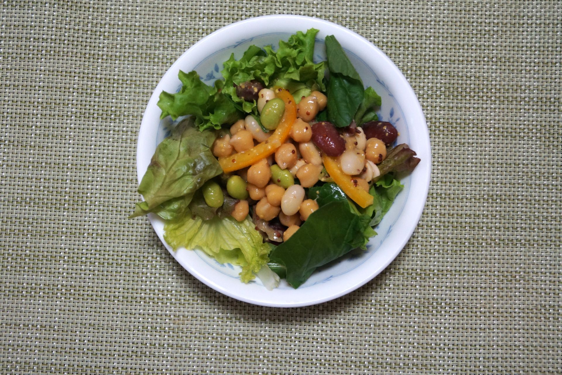 いんげんとミックスビーンズとひよこ豆はさっと茹でる。インゲンは3センチの長さに切る。黄パプリカは千切りにする。