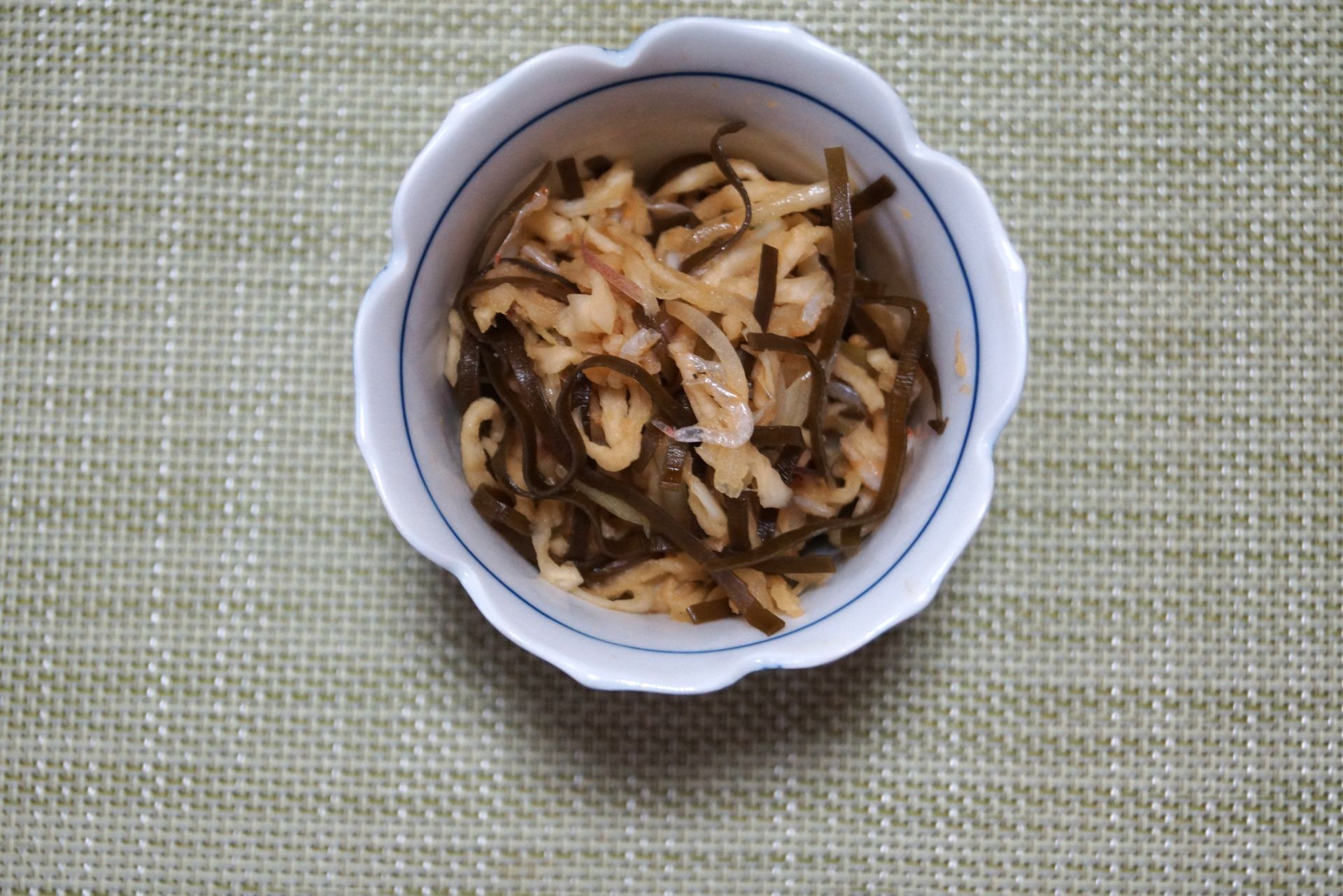 水気を切った切干大根、刻み昆布、玉ねぎとミョウガ、大葉、桜エビをA.調味料で和えたら出来上がり。