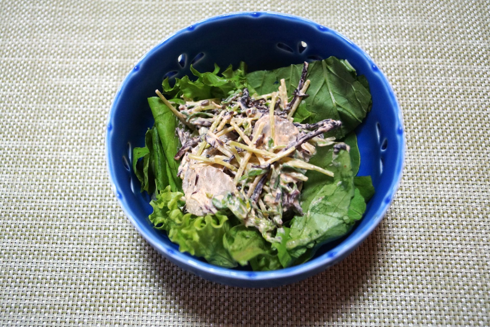 ごぼうは薄切りにしてさっと茹でる。ひじきは水で戻して下茹でする。豆苗は3センチの長さに切る。レタス類は一口大に切る。