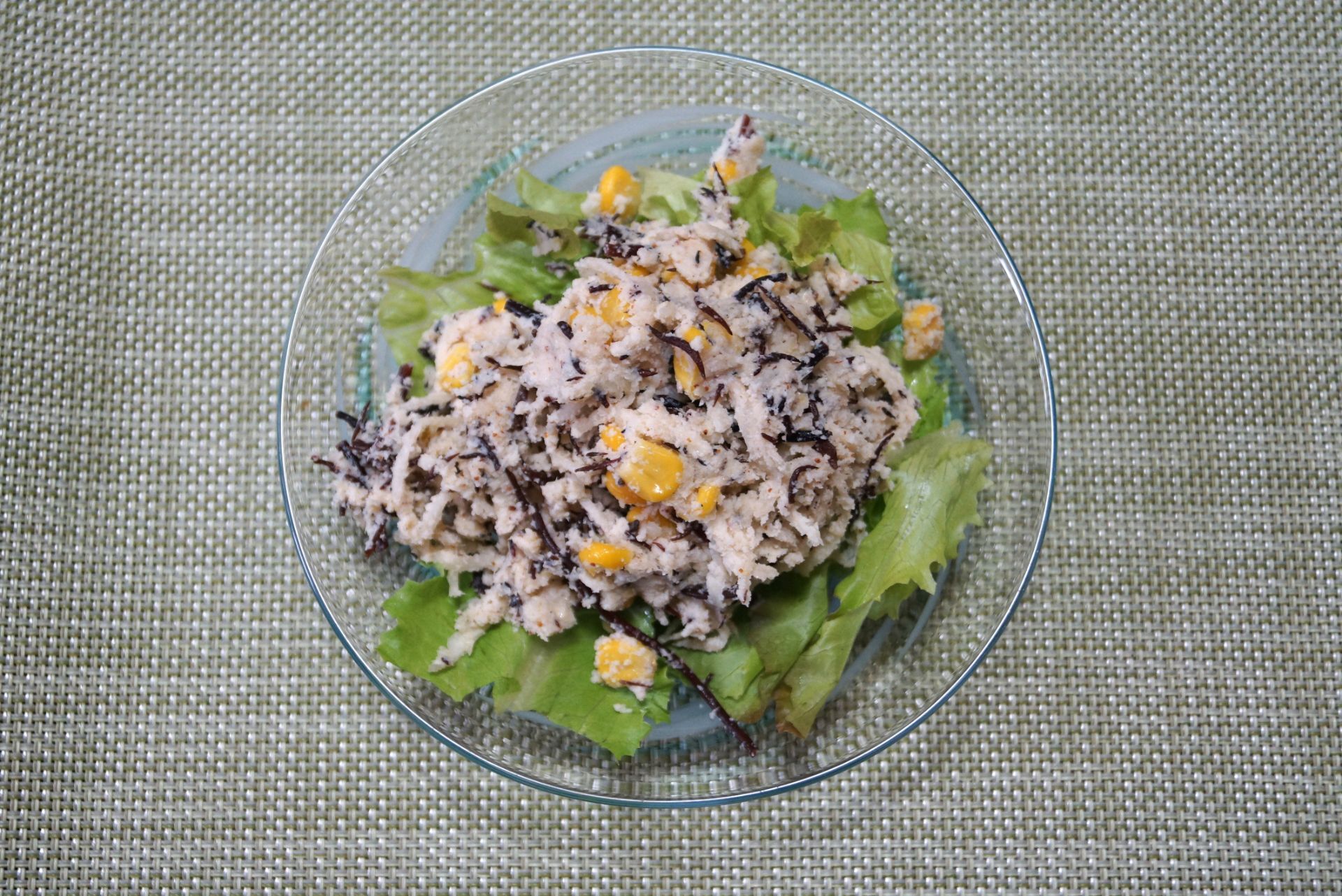 ❸に水気を切った切干大根・ひじき・コーン・おからを加えて和える。
