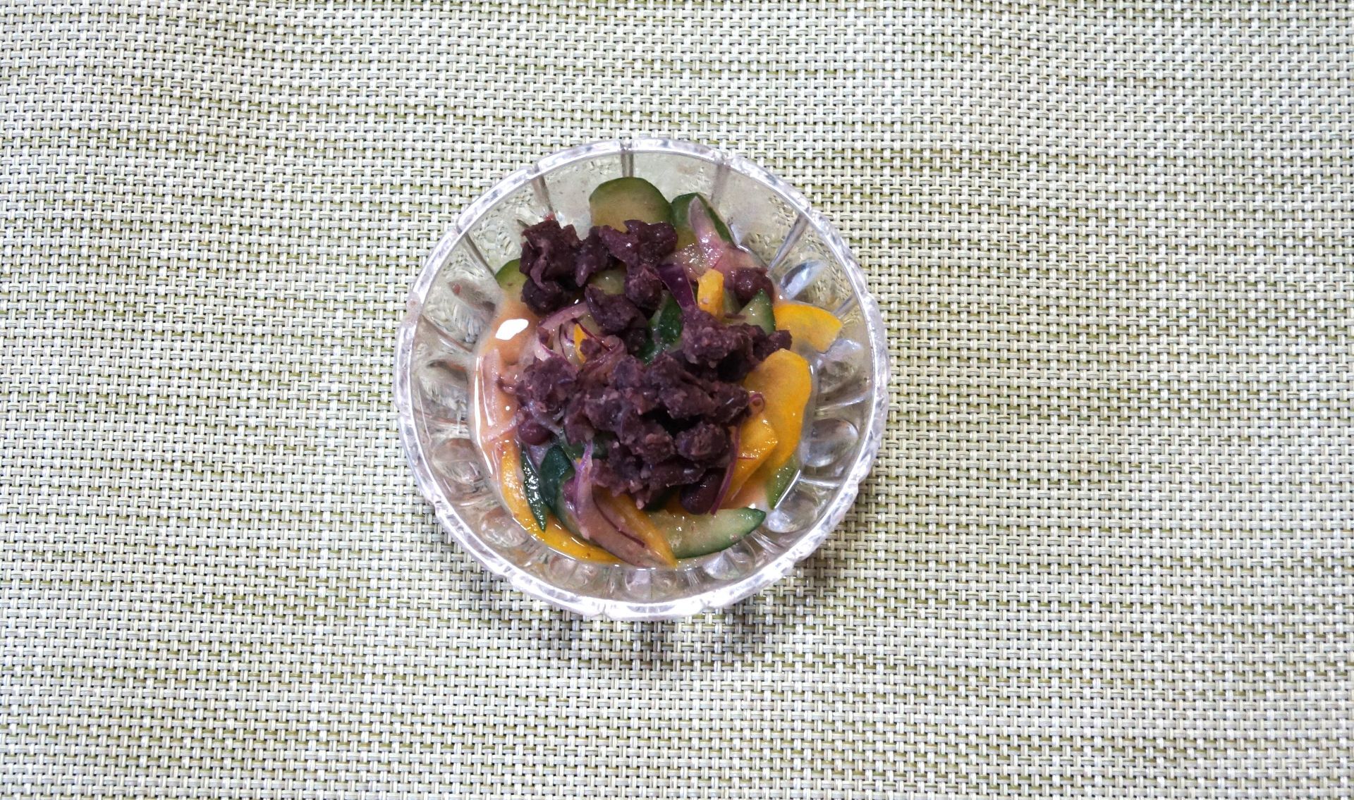 水気を切ったきゅうりと玉ねぎ・パプリカと❸を和える。塩コショウで味を調えたら、30分程味を馴染ませてる。