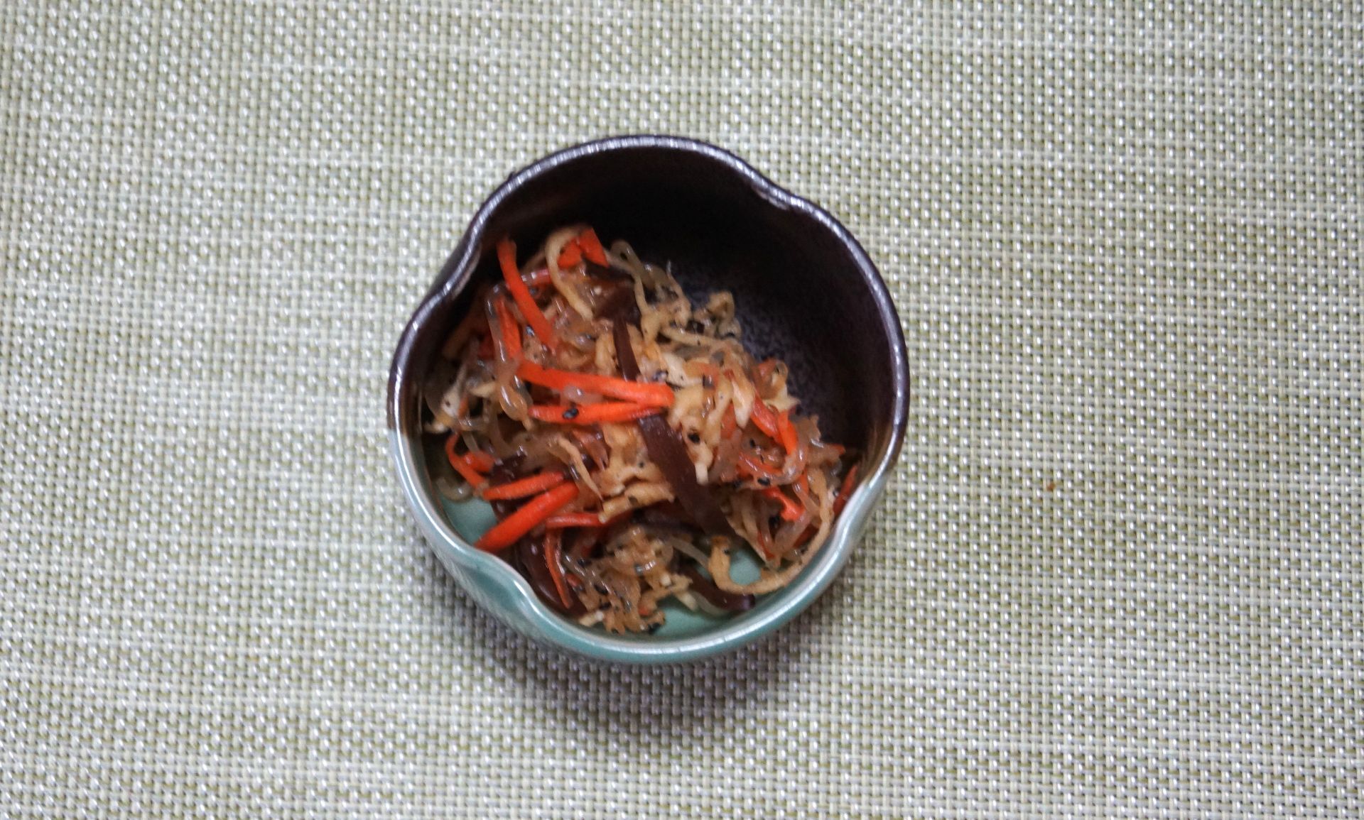 しらたきはさっとゆで食べやすい長さに切る。きくらげは水で戻して千切りにし茹でておく。人参は千切りにして塩もみしておく。切干大根はさっと洗いハサミでカットしたら分量の水で戻す。