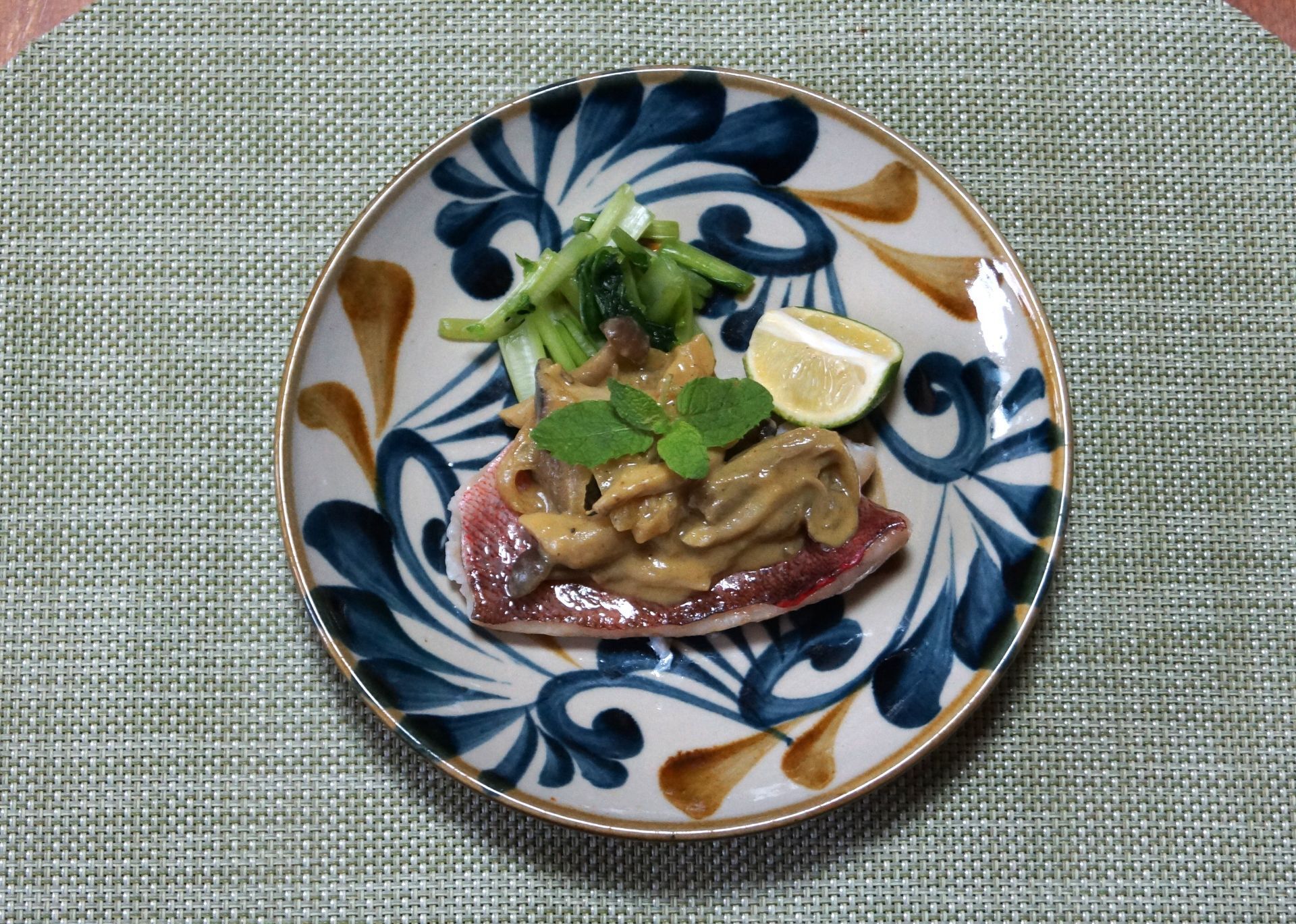 器にベビーリーフと魚を盛りつけ❹をかけて出来上がり。
