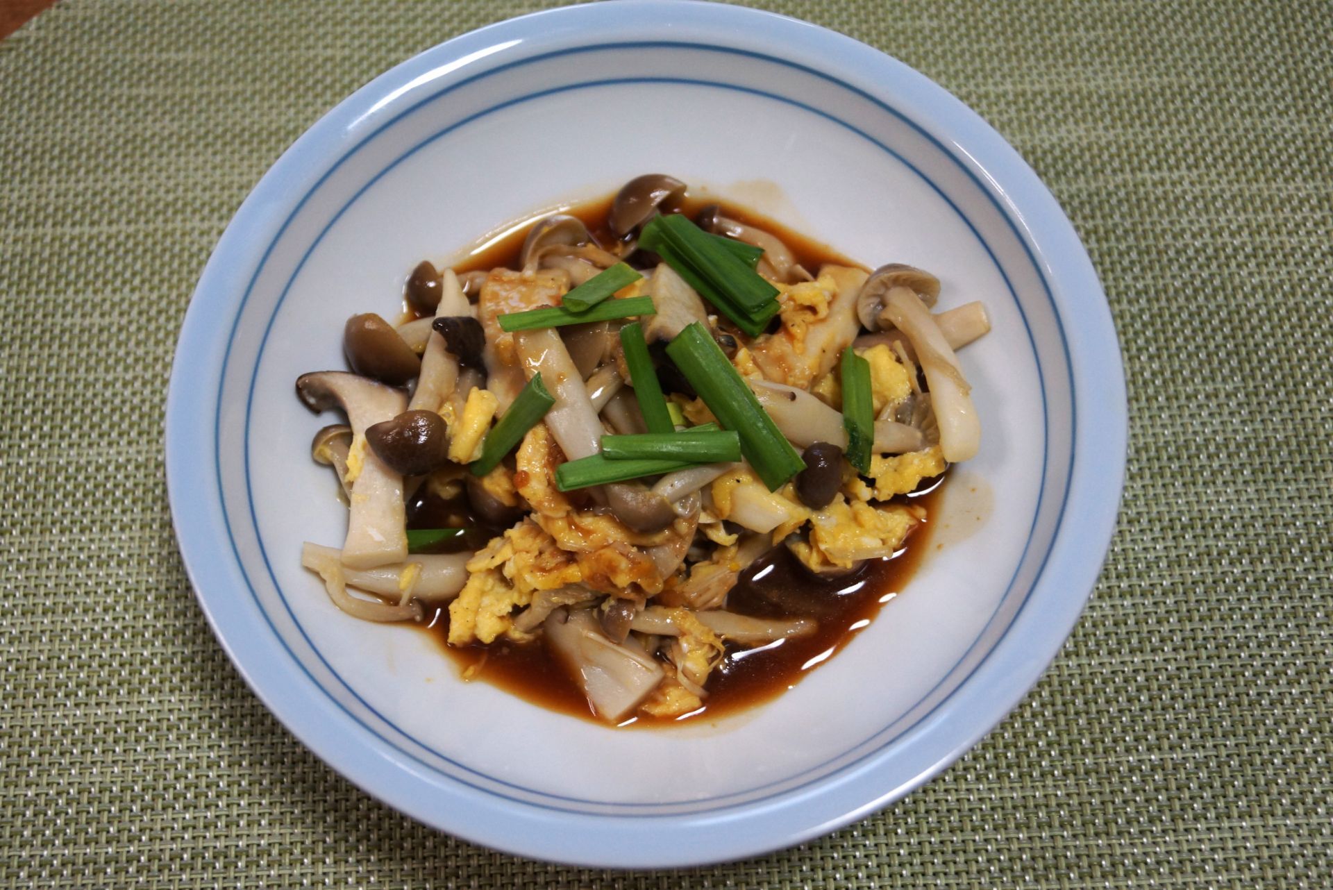 ボウルに卵を割り入れ、ニラとえのき、A調味料を加え混ぜ合わせる。