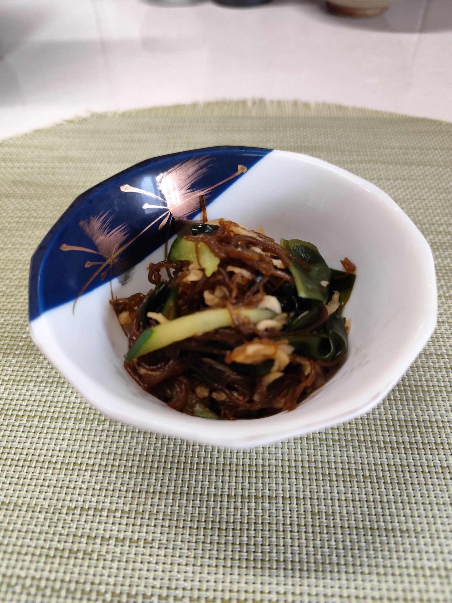 切干大根はさっと洗いハサミでカットしたら分量の水で戻す。もずくは流水で洗い、塩抜きし食べやすい長さにカットする。ワカメは水で戻す。胡瓜は千切りにして塩もみしておく。生姜は千切りにしておく。
