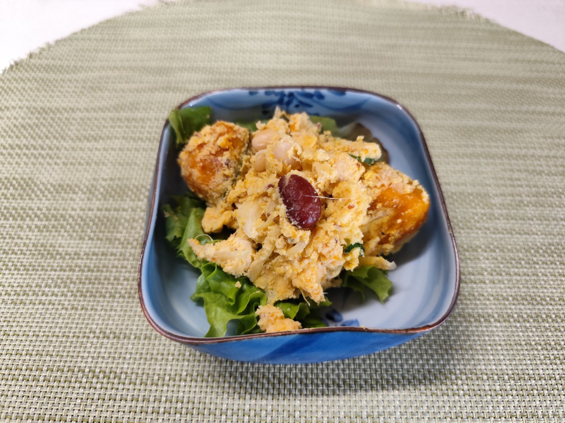おからは蒸し、かぼちゃは一口大にカットして蒸す。胡瓜は薄切りにして塩もみする。玉ねぎは薄切りにして水にさらす。ミックスビーンズはさっと茹でる。