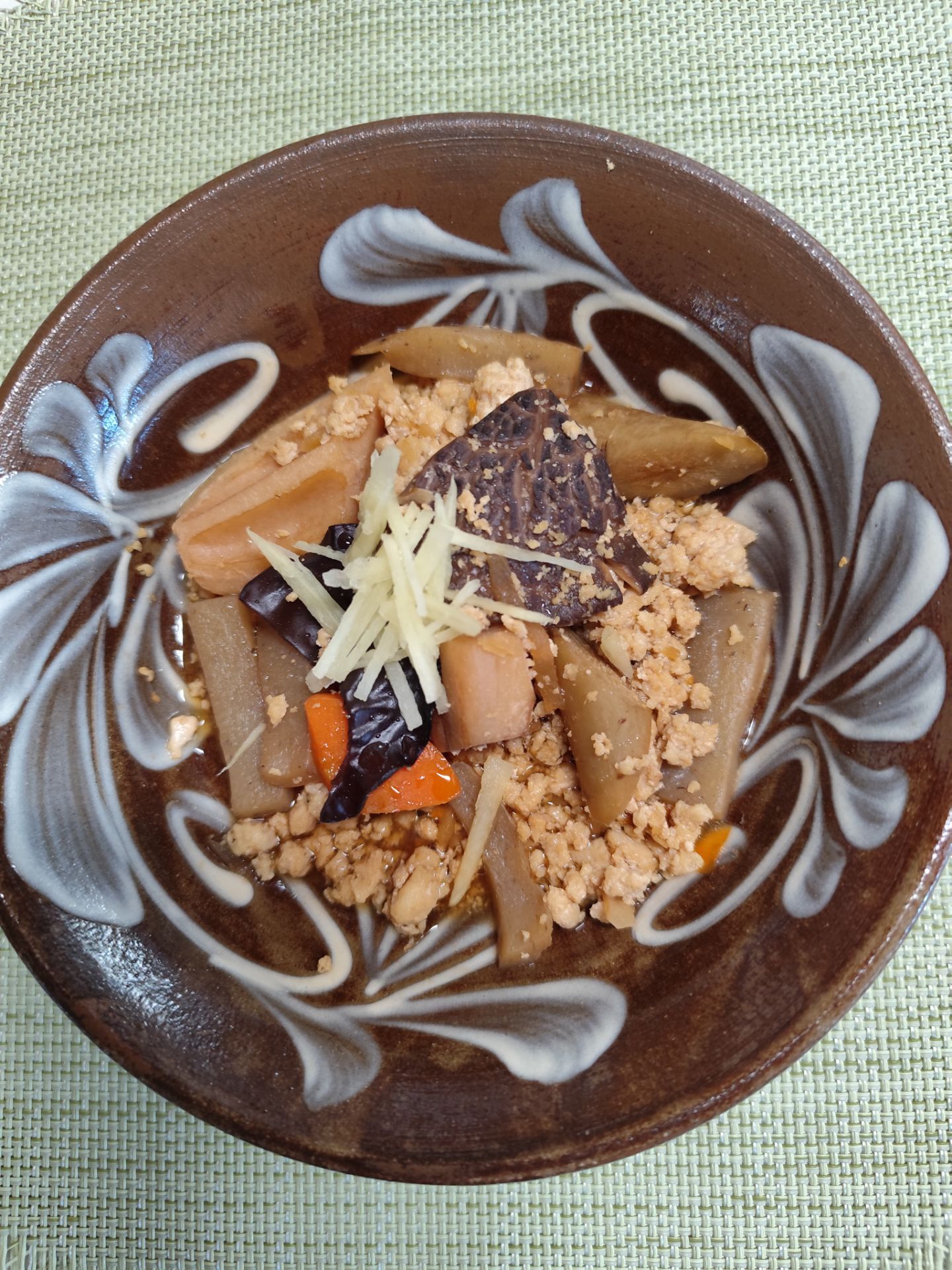 鍋に油を熱し、生姜を炒め、ひき肉を加える。肉に火が通ったらレンコン・ごぼう・人参を加え炒め合わせる。