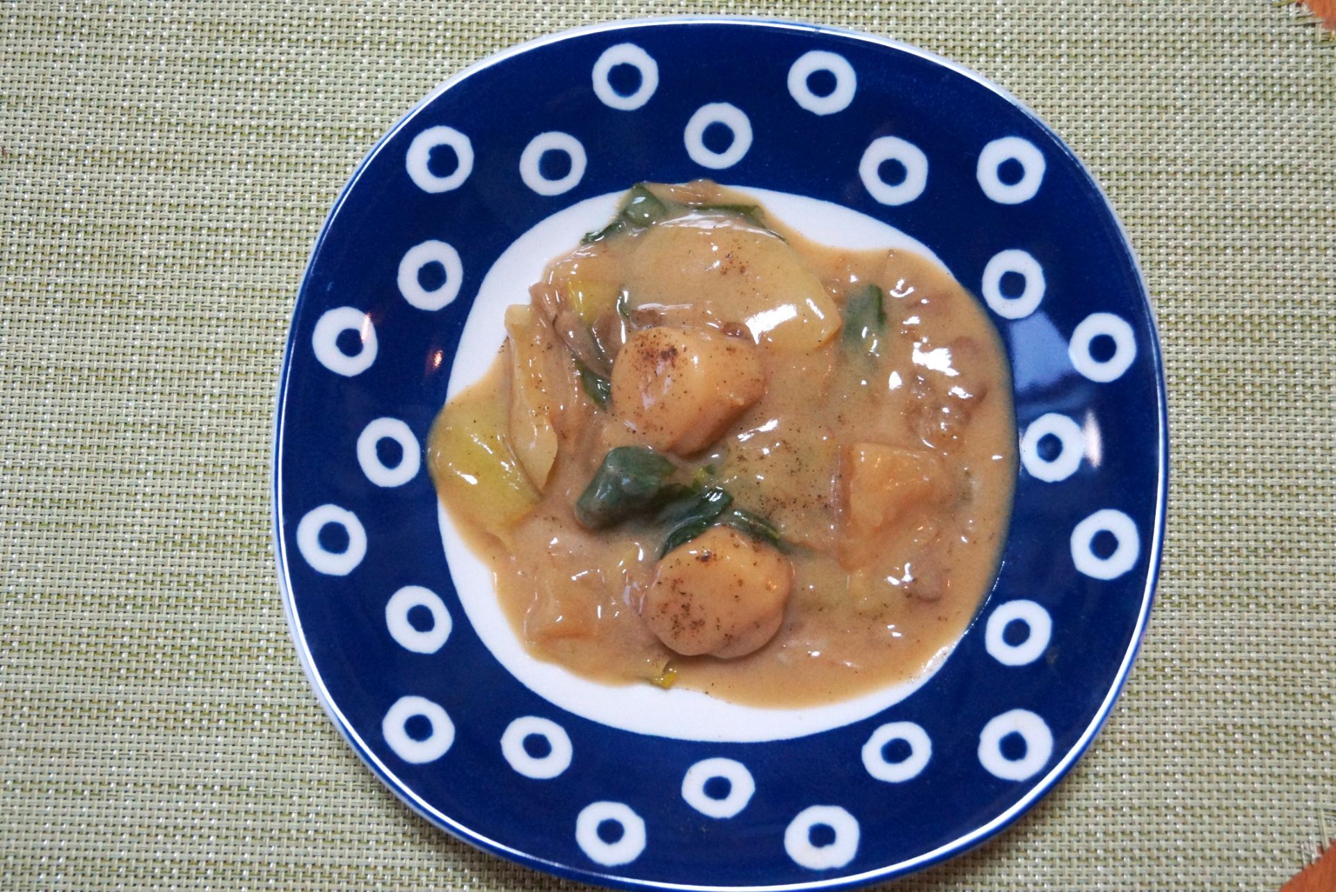 ❷にチンゲン菜の茎を加え、更に3分程煮たらホタテとチンゲン菜の葉、塩と醤油を加え味を調える。ひと煮立ちしたら水溶き片栗粉でとろみをつけ、仕上げに豆乳を加えてさっと混ぜる。