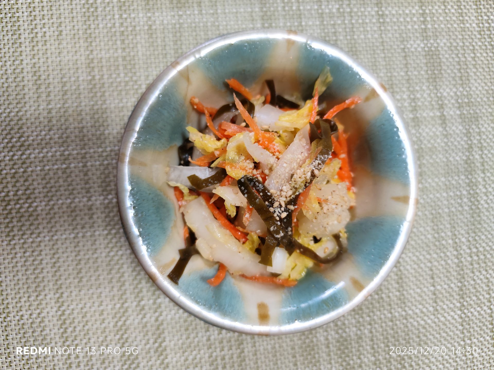 Homeレシピ紹介副菜白菜のにんにく塩麴ナムル Categories: 副菜 白菜のにんにく塩麴ナムル 当クリニックからレシピ紹介 Posted on 2025.12.24 by ゆいクリニック (沖縄市の産婦人科) Tags: カゼインフリー グルテンフリー ナムル ビーガン ベジタリアン ゆいレシピ ローフード 昆布 白菜 砂糖なし 砂糖不使用 白菜のにんにく塩麴ナムル 材料 (5人分) 白菜 350g 人参 50g 刻み昆布 5g 調味料 にんにく塩麴 5g ごま油 10g 塩 適量 すりごま 10g 1調理手順 白菜と人参は千切りにして塩もみする。昆布は水で戻して食べやすい大きさにカットする。 2調理手順 全ての調味料を混ぜ合わせる。 3調理手順 ❷に水気を絞った❶を加えて和える。