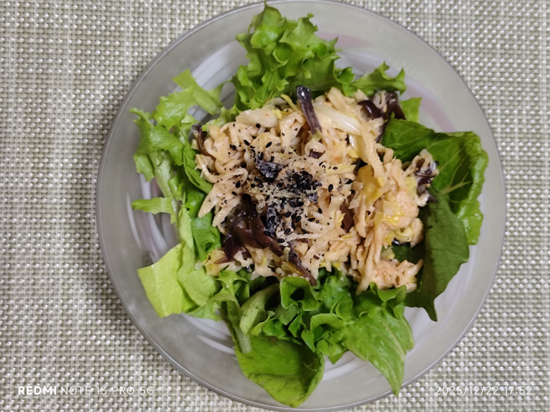 ❷に水気を絞った切干大根、キャベツ、キクラゲ、桜エビを加えて和える。