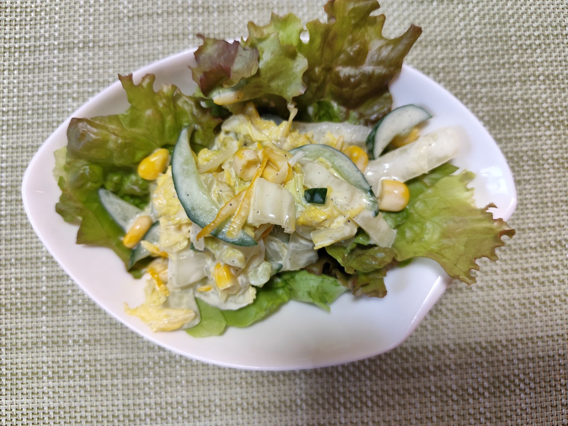 白菜ときゅうりは太めの千切りにして塩もみする。コーンはさっと茹でる。レタスは一口大に切る。
