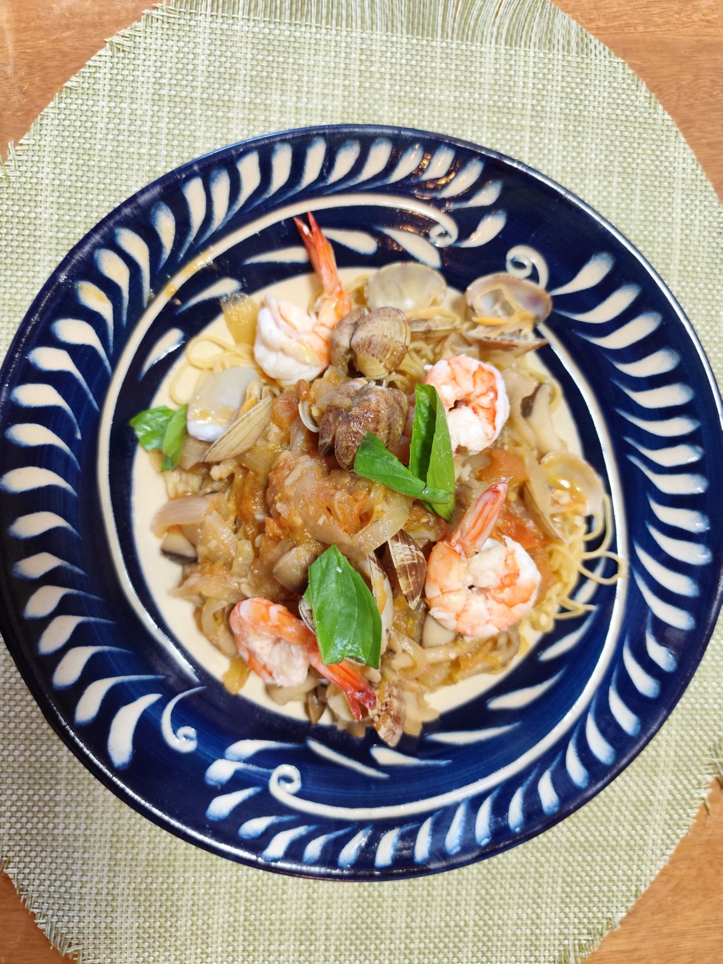 たっぷりのお湯でゼンブヌードルを茹で、器に盛りつけ、❹をかけ、エビとアサリとバジルをのせて出来上がり。